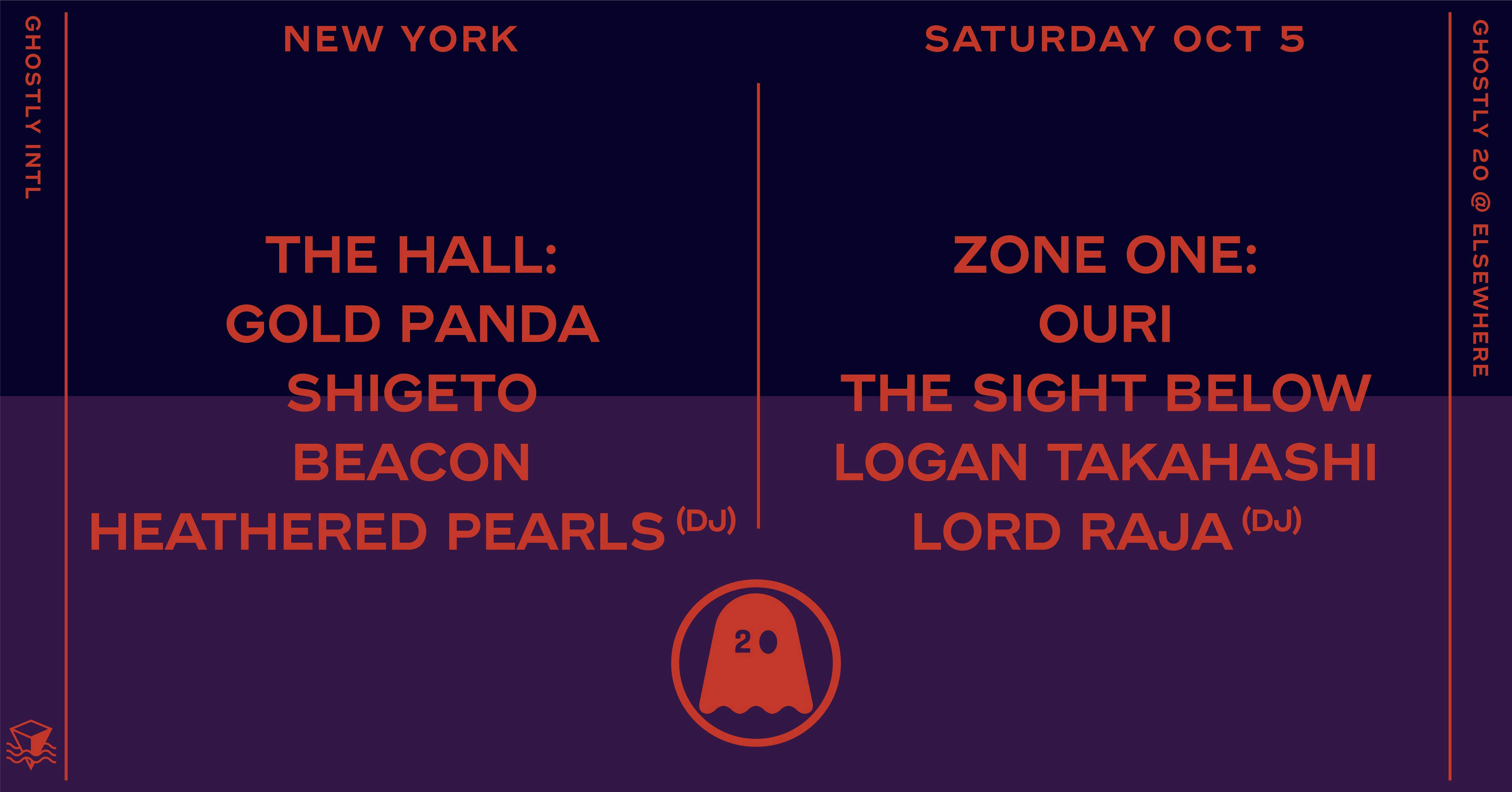 **The above tickets at the $20, $25, $30 prices grant admission ONLY to the early portion of the Ghostly 20 takeover at Elsewhere from 6PM-10PMTo mark its 20th anniversary, record label Ghostly International has launched a series of events throughout 2019 highlighting cities they love, communities that inspire them, places and people vital to their culture of music, art, design, and creativity. On Saturday, October 5th, the celebration heads to Brooklyn’s Elsewhere for a full night of performances and DJ sets from Ghostly artists and friends spread across the venue's multi-room layout. The event is divided into two parts with the early show taking place in The Hall and Zone One, featuring live sets by Gold Panda, Shigeto, Ouri, The Sight Below and more. The late show continues in The Hall with DJ sets by Matthew Dear, Ciel, and Galcher Lustwerk. The Loft is open all night long hosting DJ sets by Starchild & The New Romantic, Michna, and Xeno and Oaklander.Tickets available for early, late, or both tiers combined.The Hall:Gold PandaShigetoBeaconHeathered Pearls (DJ)Zone One:OuriThe Sight BelowLogan TakahashiLord RAJA (DJ)The Loft:Starchild & The New Romantic (DJ)