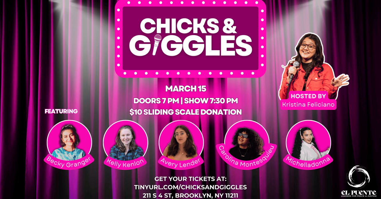 As part of El Puente’s MANIFEST Annual Celebration of Wom*n’s History Month, Chicks & Giggles is bringing you a night of side-splitting comedy featuring some of the funniest women in the game. Hosted by the incredibly talented Kristina Feliciano, this event is all about celebrating the power, humor, and brilliance of women on stage!