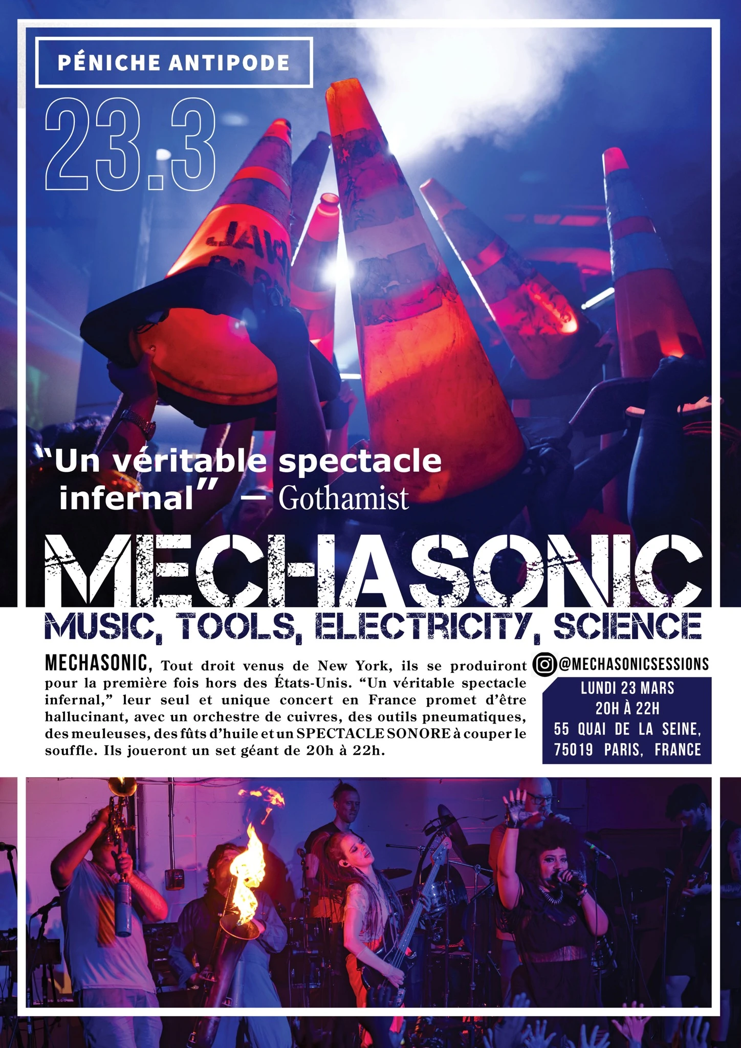 Mechasonic, direct from New York City, will be performing for the first time outside of their native United States. "Like a talent show in hell,” their only show in France will be nothing short of mind-melting, featuring a brass band, pneumatic tools, grinders, oil drums, and all levels of SONIC SPECTACLE. They will play one giant set from 8-10pm.