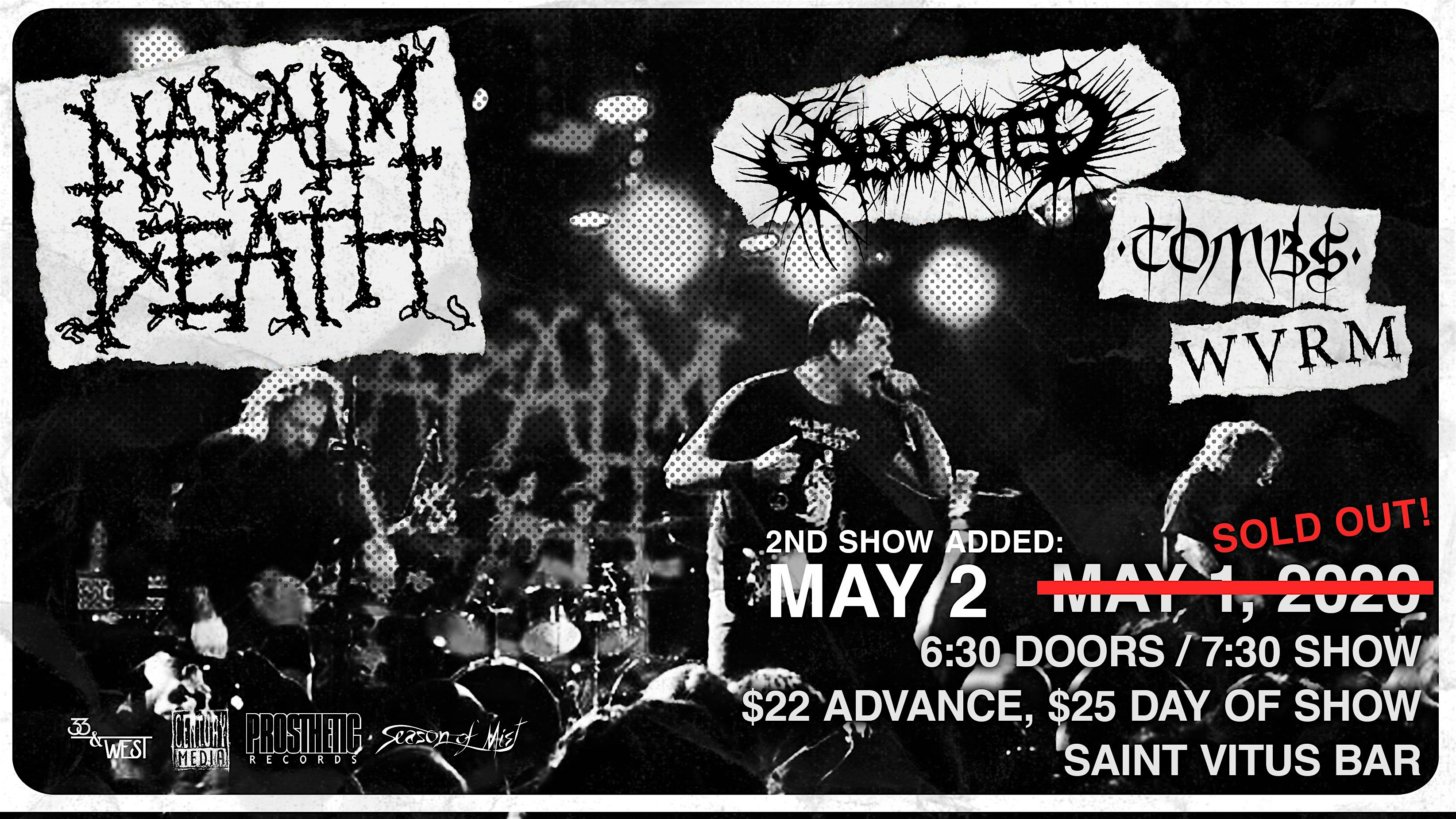 The legendary NAPALM DEATH play Vitus with Aborted, Tombs, and WVRM! 2nd night added by popular demand.