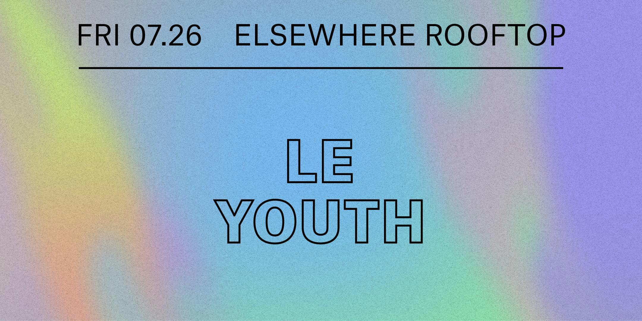 ADVANCE TICKETS ARE NOW SOLD OUT, PLENTY OF TICKETS WILL BE AVAILABLE AT THE DOOR, PLEASE ARRIVE EARLY FOR YOUR BEST CHANCE TO GRAB THEM☼ Performances└ Le Youth└└ Tee Lerrone Doors: 5PMPerformances: 5PM - 10PMRoof deck closes at: 4AMstick around for Juan Power etc... tickets will be available downstairs on the ground floor. there’s always lots else to explore besides the rooftop! most nights are multi-room celebrations, featuring a dynamic lineup of local and international talent in the hall and zone one. if you haven’t noticed already, our loft tucked into the 2nd floor now has its own dj booth and hosts free parties throughout the week. make sure to check our calendar at www.elsewherebrooklyn.com/events to see what else is happening at elsewhere the night of your visit! ---- ☼ About Elsewhere RooftopElsewhere Rooftop is a seasonal large outdoor bar and events space, offering a signature frozen drink menu, shows & parties, sunset DJ sessions, food pop-ups, film screenings, art happenings, and much more all summer. Full calendar at https://bit.ly/2UMjRb3 ☼ Hours*The Rooftop usually opens at 6PM Monday through Friday and 2PM Saturday & Sunday, but is only open when the following events are happening: https://bit.ly/2UMjRb3 — please do make sure to check the rooftop calendar before stopping by! ☼ FoodFood is provided every Friday through Sunday this season by our good friends at Holy Ground BBQ, Brooklyn's tastiest BBQ pop-up. You can view the full menu here: https://bit.ly/2WHCB8J ☼ Rain or Shine PolicyAll shows and events on the Rooftop are rain or shine! If the weather prevents us from carrying on, we will update customers via our website, Facebook, Instagram, Twitter, Eventbrite and Resident Advisor.  ☼ Safer Space PolicyELSEWHERE MAINTAINS A STRICT ZERO TOLERANCE POLICY FOR HARASSMENTElsewhere is intended to be a safe space to enjoy music, art, expression, and free play. Our staff are trained to remove individuals engaging in any form of sexual harassment, acts of aggression (including leering), racism, misogyny, transphobia, homophobia, religious bigotry, or hatred and discrimination of any kind. If you see or experience any unwanted attention, contact, bullying, harassment, or behavior of any kind that makes you uncomfortable, please speak out and notify our staff immediately.Please read our full policy at: https://bit.ly/2VxByad