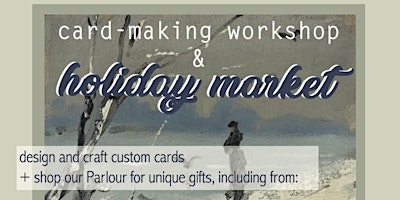 Bringing the wine to the last night of Hanukkah?Need a special card for Mom's Christmas gift?Want to impress your partner's fam for the holidays?Then come to our card-making workshop!!Show off your best craft skills for the holiday season on Monday December 18th. The best accessory for any holiday gift is a thoughtful card, we always say. And if cards aren't your thing, our friend Corey Downs will be there at 7 PM to lead a collage ornament demo. $5 entry includes all materials needed for card-making, although you are welcome to bring anything specific you'd like to use. *Anyone 18 years and younger can come for FREE!*And parents, we're kid-friendly for this one!We have fine art paper, art books, magazines, pastels, paints, and so much more. The creativity is really endless.++ PLUS ++The Parlour is expanding for the season as a holiday market. The best gifts are always hand-made, right? Support local artists and their practice and give the gift of art this season!
