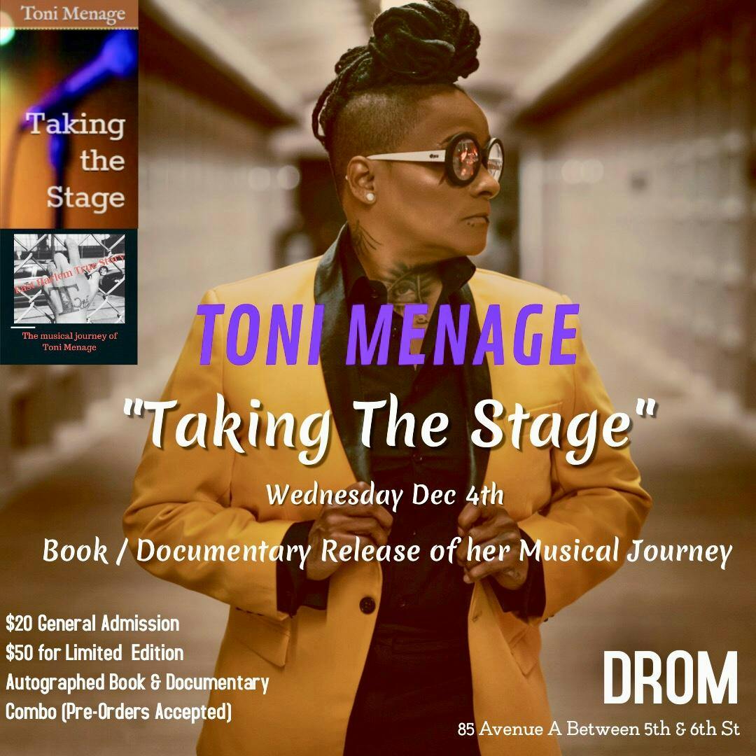 Toni Menage hosts "Taking the Stage," a Book/Documentary Release Party of her musical journey; SODISRESPECTFUL! performs live at DROM NYC.