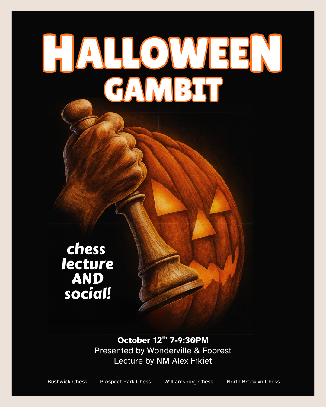 We’ll kick things off with a Halloween-themed chess lecture by NM Alex Fikiet, presented on Wonderville’s stage. After the lecture, stick around for social hour and free play - Wonderville will have tables set up with plenty of chess boards ready to go.