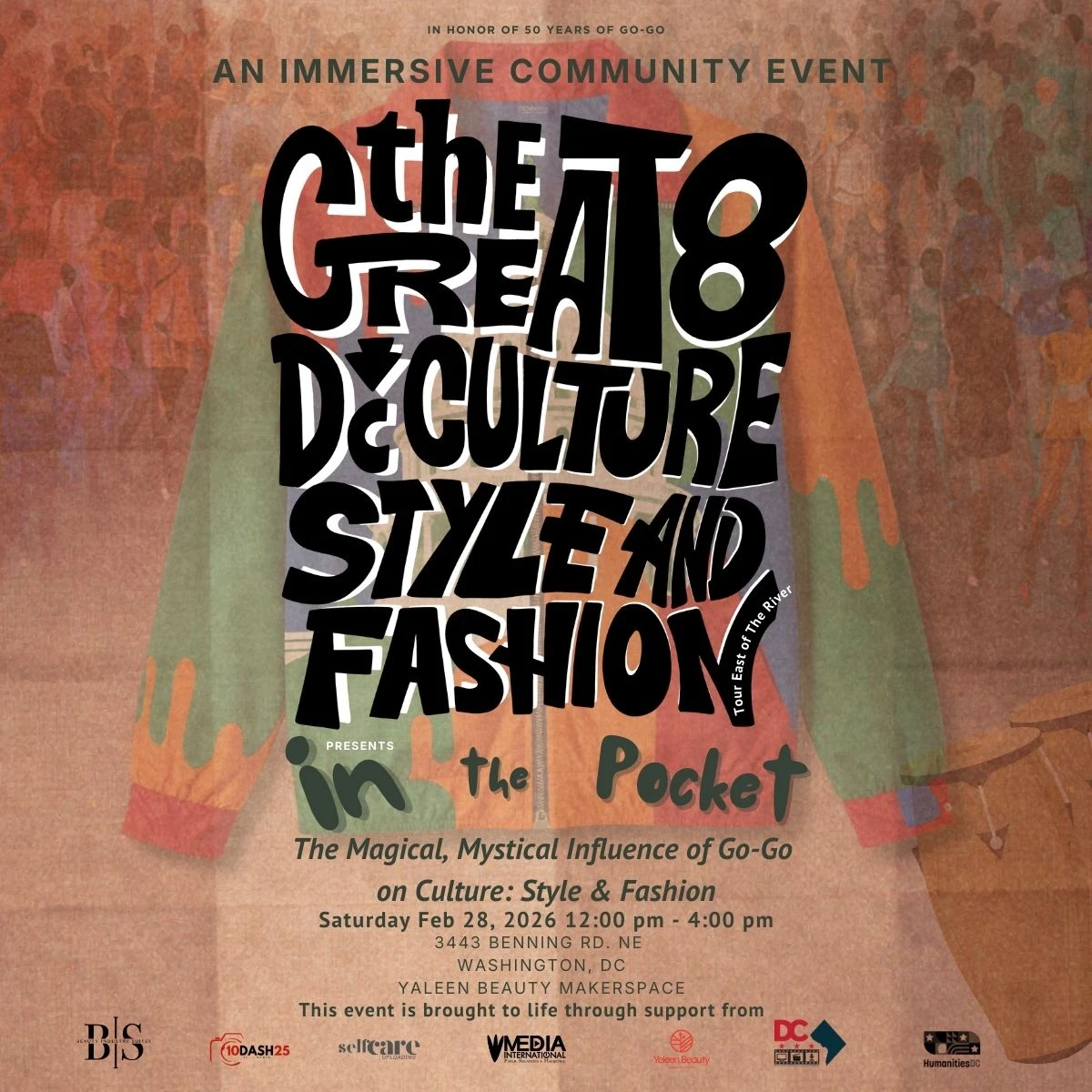 This interactive Great 8, East of The River Fashion Tour stop explores the impact of go-go music on fashion and cultural expression in Washington, DC. Through visual media, archival materials, and community storytelling, attendees will examine how rhythm, movement, and sound influence personal style, creative identity, and self-expression.