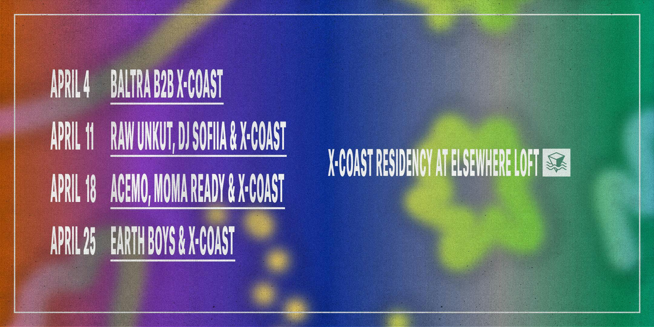 serbian-born producer and DJ X-Coast creates a buoyant combination of lo-fi house, 90's rave music, and tropical sounds. since moving to brooklyn, the artist has become a staple of the city's underground dance scene. since the start of the year, the artist has released "mi sabor," his debut for big beat records, and a 2-track ep caleed 'bailando.' x-coast has also recently announced the launch of his own record label called riviera records. he's joined by the likes of baltra, raw unkut, dj sofiia, ace mo, moma ready, and earth boys for his april residency in the elsewhere loft.
