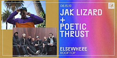 ☼ Performances└ Jak Lizard + Poetic Thrust Doors: 6PMPerformances: 6PM - 10PMRoof deck closes at: 2AM stick around for Hunx & His Punx etc... tickets will be available downstairs on the ground floor. there’s always lots else to explore besides the rooftop! most nights are multi-room celebrations, featuring a dynamic lineup of local and international talent in the hall and zone one. if you haven’t noticed already, our loft tucked into the 2nd floor now has its own dj booth and hosts free parties throughout the week. make sure to check our calendar at www.elsewherebrooklyn.com/events to see what else is happening at elsewhere the night of your visit!soulful and vibrant, the refined sounds of jak lizard echo the decades of musical history that precede it. merging jazz, soul, and hip-hop, the new york singer/songwriter creates a timeless sound to accompany his sharp lyricism. poetic thrust are familiar faces in the brooklyn live hip-hop scene. pairing the raw energies of live jazz music and rap, poetic thrust can keep any room bouncing along. ---- ☼ About Elsewhere RooftopElsewhere Rooftop is a seasonal large outdoor bar and events space, offering a signature frozen drink menu, shows & parties, sunset DJ sessions, food pop-ups, film screenings, art happenings, and much more all summer. Full calendar at https://bit.ly/2UMjRb3 ☼ Hours*The Rooftop usually opens at 6PM Monday through Friday and 2PM Saturday & Sunday, but is only open when the following events are happening: https://bit.ly/2UMjRb3 — please do make sure to check the rooftop calendar before stopping by! ☼ Rain or Shine PolicyAll shows and events on the Rooftop are rain or shine! If the weather prevents us from carrying on, we will update customers via our website, Facebook, Instagram, Twitter, Eventbrite and Resident Advisor.  ☼ Safer Space PolicyELSEWHERE MAINTAINS A STRICT ZERO TOLERANCE POLICY FOR HARASSMENTElsewhere is intended to be a safe space to enjoy music, art, expression, and free play. Our staff are trained to remove individuals engaging in any form of sexual harassment, acts of aggression (including leering), racism, misogyny, transphobia, homophobia, religious bigotry, or hatred and discrimination of any kind. If you see or experience any unwanted attention, contact, bullying, harassment, or behavior of any kind that makes you uncomfortable, please speak out and notify our staff immediately.Please read our full policy at: https://bit.ly/2VxByad
