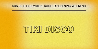 ** Plenty of tickets available at the door for our rooftop opening weekend party with Tiki Disco! Please arrive early to ensure entry.**This party is rain or shine! In the event of rain, we will be moving the party indoors.☼ ☼ ELSEWHERE ROOFTOP ☼ ☼☼ ☼ OPENING WEEKEND! ☼ ☼☼ Performances└ Tiki DiscoDoors: 2PMPerformances: 2PM - 10PMRoof deck closes at: 1AMAs TIKI DISCO enters its 10th Summer season we're absolutely thrilled to announce our new roof top residency at Elsewhere in Brooklyn! Once a month, starting on Sunday May 19th and running through September the day long party will set up shop on Elsewhere's spectacular roof. This Summer expect plenty of good times with Tiki residents Eli Escobar , Andy Pry & LLoydski, a special guest or two and be sure to check for complete dates and info at www.tikidisco.com----☼ About Elsewhere RooftopElsewhere Rooftop is a seasonal large outdoor bar and events space, offering a signature frozen drink menu, shows & parties, sunset DJ sessions, food pop-ups, film screenings, art happenings, and much more all summer. Full calendar at https://bit.ly/2UMjRb3☼ Hours*The Rooftop usually opens at 6PM Monday through Friday and 2PM Saturday & Sunday, but is only open when events are happening — please do make sure to check our venue calendar before stopping by here: https://bit.ly/2VHNafy ☼ FoodFood is provided every Friday through Sunday this season by our good friends at Holy Ground BBQ, Brooklyn's tastiest BBQ pop-up. You can view the full menu here: https://bit.ly/2WHCB8J☼ Rain or Shine PolicyAll shows and events on the Rooftop are rain or shine! If the weather prevents us from carrying on, we will update customers via our website, Facebook, Instagram, Twitter, Eventbrite and Resident Advisor.☼ Safer Space PolicyELSEWHERE MAINTAINS A STRICT ZERO TOLERANCE POLICY FOR HARASSMENTElsewhere is intended to be a safe space to enjoy music, art, expression, and free play. Our staff are trained to remove individuals engaging in any form of sexual harassment, acts of aggression (including leering), racism, misogyny, transphobia, homophobia, religious bigotry, or hatred and discrimination of any kind.If you see or experience any unwanted attention, contact, bullying, harassment, or behavior of any kind that makes you uncomfortable, please speak out and notify our staff immediately.Please read our full policy at: https://bit.ly/2VxByad