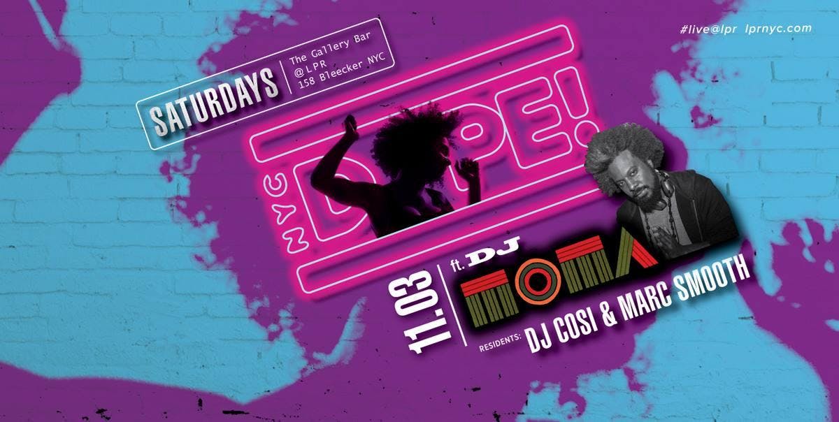 NYC Dope is proud to welcome DJ Moma to our party. Moma has been killing the scene with his incredible "Everyday People" Party, selling out big rooms all over NYC, L.A. and around the world! We're super excited for his to touch down at NYC Dope. You don't want to miss this.DJ Cosi and Marc Smooth (Freedom Party NYC) host their classic dance party that aims to preserve the essence of “Old” New York City Nightlife culture. They're taking it back to a time where music was the "answer" and folks got down and "danced like no one's watching." Expect to hear a Classic Soundtrack of 80s/90s Pop, Soul Classics, Golden Era Hip Hop, Soulful House, Classic Rock, Dancehall Reggae, Soca, Latin, Afrobeats and some new classics that stand the test of time. Come party with some of the best dancers in the city and a great crowd of New Yorkers who love to dance, sing-a-long, drink, party and create community! At NYC Dope we're all about bringing together people from all walks of life to share the love of good music and dancing, it's a family affair in here.The Gallery at LPR is a great, intimate room with a state of the art Martin Audio Sound System which helps with creating a nice atmosphere for folks to rock to the dope tunes being spun by DJ Cosi and Marc Smooth along with Special Guest DJ Moma. Be sure to spread the word about the party and follow us on social:FB & Twitter= @nycdope IG= @nycdopeparty #NYCDOPENYC Dope! Dance Party at The Gallery at LPR 158 Bleecker Street (Thompson & Sullivan) 10pm-4am$10 General Admission