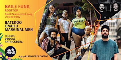 **This event will not accept the Saturdays + Sundays RSVP for free rooftop entry before 4pm listed on the Elsewhere websiteBrasil Summerfest: Baile Funk Rooftop Festival Closing PartyFestival closing party featuring baile funk’s hottest party collectives and genre bending DJs from Brazil. BATEKOOBATEKOO is the premiere LGBT, Afro-Centric party collective in Brazil. The collective was born in Salvador, Bahia in 2014 as a party made by black producers for the black marginalized community. Nowadays, it has a configuration of a movement that aims to increase value and promote black culture and its aesthetics. Since its creation, BATEKOO's goal is to empower urban youth all over Brazil, focusing on generating a safe space to all the minorities from the LGBT community. The vibe you'll find at a BATEKOO party is a mixture of urban Afro-American with Brazilian funk events that happen in the favelas. The DJ sets range from baile funk, trap, kuduro and hip hop. In 2018, BATEKOO was recognized as São Paulo’s best party by Folha de São Paulo, the country’s main newspaper. Red Bull documentary on BATEKOOwww.facebook.com/batekoo/https://soundcloud.com/batekooOMULURio de Janeiro producer and DJ Omulu aka Antonio Antmaper is one of the creators of Rasteirinha, a blend of funk carioca with reggaeton and axé. Ask him about Brazilian funk’s global success and he’ll tell you that he had something to do with it. “I feel a little responsible for this second baile funk world wave,” he says. “I first sent MC Bin Laden and Brinquedo songs to Diplo, and I think he introduced it to Skrillex, who made ‘Bololo Ha Ha’ known everywhere.” The rasterinha-bass-mestre continues to release dancefloor monsters and tour the world over. www.facebook.com/omulu/https://soundcloud.com/omuluMARGINAL MENThe Rio de Janeiro bass bandits Marginal Men have become synonymous with explosive DJ sets. The duo is made up of Gustavo Elsas and Pedro Fontes who were creators of Wobble, a party voted 'best party' by Rio 2014 Night Prize. Since then, Marginal Men has been performing festivals in Brazil and around the world, and releasing bass crushing productions with collaborators including MC Bin Laden, Branko, MC Toy, and many more.www.facebook.com/MarginalMen/https://soundcloud.com/marginal-menBoiler Room x Red Bull set::: In the Loft :::PATRICKTØR4Recifé based DJ and Radiomaker Patricktør4 is one of Brazil’s main underground DJs. His sets deconstruct the music of Brazil and that of the world. From northeastern Baião, African Kuduro to Carioca's baile funk, Latin Pará's Tecnobrega to Cumbia Digital, the result of these combinations makes his sets full of high energy.https://soundcloud.com/patricktor4https://www.facebook.com/djpatricktor4/DEØGAZDJ and production duo Gaspar Muniz and Deo Jorge have been working the decks behind clubs like Output and Le Bain and have garnered fame with their Onda party during Rio de Janeiro carnival. Ready to release an EP of Brazilian edits, Deøgaz mixes deep tropical cuts and Afro-diasporic rhythms. ABOUT BRASIL SUMMERFESTBrasil Summerfest is the country’s premier contemporary Brazilian music & arts festival showcasing some of the country's most dynamic artists, as well as film screenings, art displays, talks and special events that celebrate the diverse cultural offerings of Brazil. This event is the festival’s 2019 closing party.www.brasilsummerfest.com