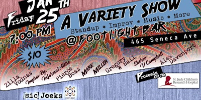 Variety Show Featuring, Stand-Up, Improv, Music and More.Proceeds will be donated to St. Jude Children's Research HospitalStand-Up from:Zilla VodnasGregory W HallAlex DavenportPierce BoazMusic From:Sheree V CampbellImprov from:Informal Attire"More" from:Host Best Mark Miller$5 off your Lyft for the first 10 to ride to the show using the code: SICJOEKS0125