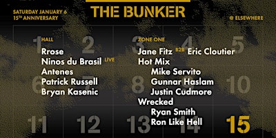 [[ 10PM - 6AM ]]As 2017 winds down, we're looking back at what was another very busy year for The Bunker. The label released 5 EPs and an album, our long-running podcast series added 21 new entries, and we broadcast 36 episodes of our Red Bull Radio program. Bryan and the rest of our resident DJs have become increasingly busy bringing The Bunker sound to more locations across the globe than we could possibly list here, leading us to limit ourselves to throwing just 12 events in New York in the past year. It doesn't seem so long ago that we started The Bunker as a weekly party in the dinky basement full of wine casks at subTonic, but low and behold it's been 15 (!!!) years, which is something to celebrate. So we're doing just that by bringing together a stacked lineup of our resident DJs, label artists, and dear friends. We're very excited to announce that this will be our first party at Brooklyn's newest venue, Elsewhere, conveniently based in Bushwick and operated by our good friends from Popgun. For those of you who've been feeling the squeeze at some of our recent parties, Elsewhere's increased capacity should give us more room to spread out and dance.We were hoping to get all 5 of our resident DJs on this lineup, as we feel their sets at the party over the years have clearly defined what The Bunker is all about. We almost pulled that off, but with Derek Plaslaiko expecting his second child the week of this party, he sadly wont be able to make it.The Hall will be headlined by Italy's Ninos du Brasil, our newest label artists. Their high energy stage show is completely unique and not to be missed. Co-headlining is one of our most frequent and beloved guests, Rrose, with one of her singular mind-melting prime time DJ sets. We also have Antenes, who will be releasing her first EP on The Bunker NY in early 2018, and resident DJs Patrick Russell (closing) and Bryan Kasenic (opening).The intimate Zone One room will feature collaborative sets all night. We've heard such great things about Jane Fitz and Eric Cloutier's b2b set at Jane's party in London, that we had to bring it to NYC for it's North America debut. Opening the room will be our longterm friends and collaborators Ryan Smith and Ron Like Hell of Wrecked, and closing it down will be The Bunker's Hot Mix, made up of Mike Servito, Gunnar Haslam, and Justin Cudmore.--Elsewhere is intended to be a safe space to enjoy music, art, expression, and free play. Please be aware that our staff are trained to remove individuals engaging in any form of sexual harassment, acts of aggression (including leering), racism, misogyny, homophobia, transphobia, religious bigotry, or hatred and discrimination of any kind. Elsewhere reserves the right to deny, remove and/or ban any customer deemed to be disrespecting our zero-tolerance harassment policy, which can be found on our website at http://www.elsewherebrooklyn.com/harrassment-policy.All ticket sales are final, and Elsewhere does not offer refunds for any reason except event cancellation or reschedule. Opening performers, door times, and set times are subject to change without notice. All ticket holders must present valid ID upon entering, and Elsewhere reserves the right to refuse entry without refund to anyone who does not have a valid ID or meet the event's age requirement. Elsewhere does not guarantee the validity or use for admittance of tickets purchased via 3rd party resellers of any kind.