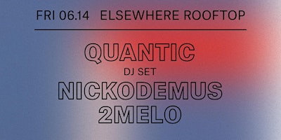 ☼ PerformancesWonderwheel Recordings & Junxion Present:└ Quantic (DJ) (Tru Thoughts Recordings)└└ Nickodemus (Wonderwheel Recordings)└└└ 2Melo (Junxion NYC)Doors: 5PMPerformances: 5PM - 10PMRoof deck closes at: 4AMstick around for BUBBLE_T, Muévete Jevi 7.0 etc... tickets will be available downstairs on the ground floor. there’s always lots else to explore besides the rooftop! most nights are multi-room celebrations, featuring a dynamic lineup of local and international talent in the hall and zone one. if you haven’t noticed already, our loft tucked into the 2nd floor now has its own dj booth and hosts free parties throughout the week. make sure to check our calendar at www.elsewherebrooklyn.com/events to see what else is happening at elsewhere the night of your visit!----☼ About Elsewhere RooftopElsewhere Rooftop is a seasonal large outdoor bar and events space, offering a signature frozen drink menu, shows & parties, sunset DJ sessions, food pop-ups, film screenings, art happenings, and much more all summer. Full calendar at https://bit.ly/2UMjRb3☼ Hours*The Rooftop usually opens at 6PM Monday through Friday and 2PM Saturday & Sunday, but is only open when the following events are happening: https://bit.ly/2UMjRb3 — please do make sure to check the rooftop calendar before stopping by! ☼ FoodFood is provided every Friday through Sunday this season by our good friends at Holy Ground BBQ, Brooklyn's tastiest BBQ pop-up. You can view the full menu here: https://bit.ly/2WHCB8J☼ Rain or Shine PolicyAll shows and events on the Rooftop are rain or shine! If the weather prevents us from carrying on, we will update customers via our website, Facebook, Instagram, Twitter, Eventbrite and Resident Advisor.☼ Safer Space PolicyELSEWHERE MAINTAINS A STRICT ZERO TOLERANCE POLICY FOR HARASSMENTElsewhere is intended to be a safe space to enjoy music, art, expression, and free play. Our staff are trained to remove individuals engaging in any form of sexual harassment, acts of aggression (including leering), racism, misogyny, transphobia, homophobia, religious bigotry, or hatred and discrimination of any kind.If you see or experience any unwanted attention, contact, bullying, harassment, or behavior of any kind that makes you uncomfortable, please speak out and notify our staff immediately.Please read our full policy at: https://bit.ly/2VxByad