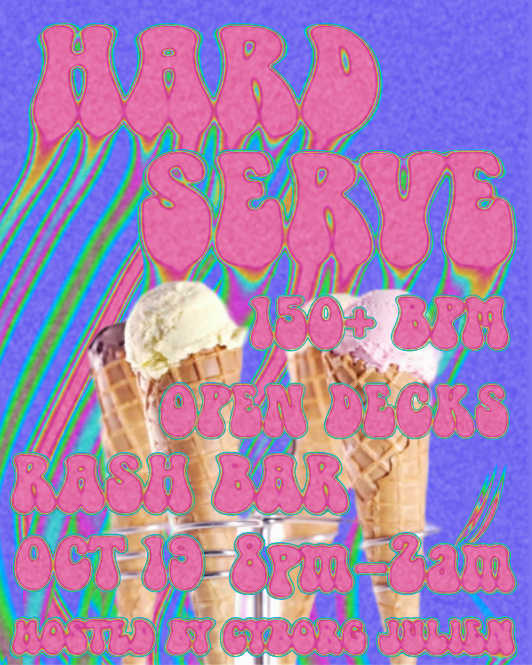 This isn't your grandma’s ice cream party- this is 150+ BPM only, served extra thick and frosty. DJs of every flavor are stepping up to the cone to whip up sets harder than frozen custard at midnight. We’re scooping out relentless kicks, crunchy snares, and basslines so cold they’ll give you brain freeze. Expect a swirl of hardcore, gabber, hard techno, and whatever else our DJs are scooping up. As long as it's served hard, it goes here. Sign-ups are in-person, and will be drawn randomly in 30 minute intervals. Step up, spin your set, and melt the floor. @cyborgjulien @rash_nyc