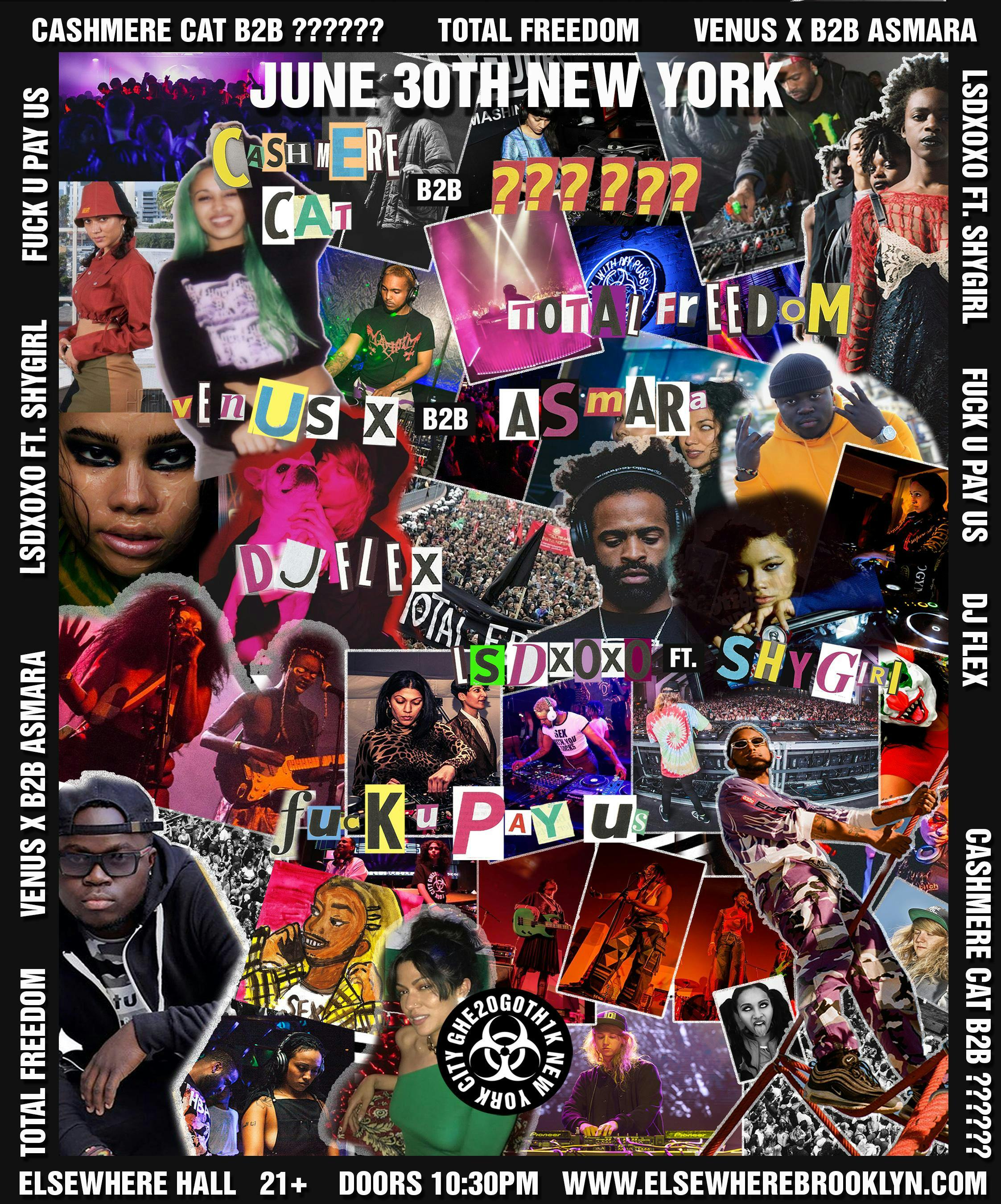heads up y'all: this summer season, the Elsewhere Rooftop will be open all night on weekends space-permitting, so grab a frozen drink with a view of the skyline when you need a breather! if you've never been to our space, there is lots else to explore too! our parties are multi-room celebrations, featuring a very large cavernous warehouse hall and a cozy dance floor in the side room, plus a small hideaway lounge tucked into the 2nd floor. make sure to wander!HALL└ Cashmere Cat B2B ??????└ └ Total Freedom└└└ Venus X B2B Asmara└└└└ LSDXOXO ft. Shygirl Live└└└└└ Fuck U Pay Us Live└└└└└└DJ Flex