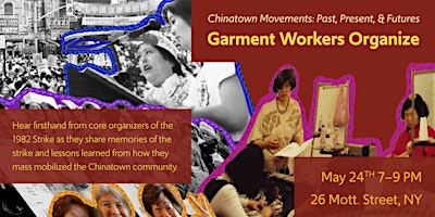 Sites of resistance line Chinatown’s streets. On Mott Street in 1982, over 20,000 garment workers once left their jobs and marched on strike to fight for better working conditions. They flooded Columbus Park with fiery multilingual speeches and protested to call for justice. Hear firsthand from core organizers of the 1982 Strike — former garment workers, organizers, and union representatives — as they share memories of the strike and lessons learned from how they mass mobilized the Chinatown community. Panelists include May Chen, Connie Ling and Shui Mak Ka.