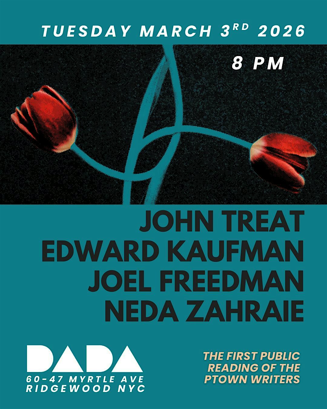 Meet the P-town writers as they share their works of prose: John Treat, Edward Kaufman, Joel Freedman, Neda Zahraie