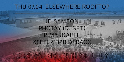 **PLENTY OF TICKETS WILL BE AVAILABLE AT THE DOOR, PLEASE ARRIVE EARLY TO ENSURE ENTRY☼ PerformancesElsewhere 4th of July w/└ JD Samson└└ Photay (DJ Set)└ └ └ Rimarkable└ └ └ Kfeelz B2B DJ RaqxDoors: 2PMPerformances: 2PM - 10PMRoof deck closes at: 1AM---- ☼ About Elsewhere RooftopElsewhere Rooftop is a seasonal large outdoor bar and events space, offering a signature frozen drink menu, shows & parties, sunset DJ sessions, food pop-ups, film screenings, art happenings, and much more all summer. Full calendar at https://bit.ly/2UMjRb3 ☼ Hours*The Rooftop usually opens at 6PM Monday through Friday and 2PM Saturday & Sunday, but is only open when the following events are happening: https://bit.ly/2UMjRb3 — please do make sure to check the rooftop calendar before stopping by! ☼ FoodFood is provided every Friday through Sunday this season by our good friends at Holy Ground BBQ, Brooklyn's tastiest BBQ pop-up. You can view the full menu here: https://bit.ly/2WHCB8J ☼ Rain or Shine PolicyAll shows and events on the Rooftop are rain or shine! If the weather prevents us from carrying on, we will update customers via our website, Facebook, Instagram, Twitter, Eventbrite and Resident Advisor. ☼ Safer Space PolicyELSEWHERE MAINTAINS A STRICT ZERO TOLERANCE POLICY FOR HARASSMENTElsewhere is intended to be a safe space to enjoy music, art, expression, and free play. Our staff are trained to remove individuals engaging in any form of sexual harassment, acts of aggression (including leering), racism, misogyny, transphobia, homophobia, religious bigotry, or hatred and discrimination of any kind. If you see or experience any unwanted attention, contact, bullying, harassment, or behavior of any kind that makes you uncomfortable, please speak out and notify our staff immediately.Please read our full policy at: https://bit.ly/2VxByad