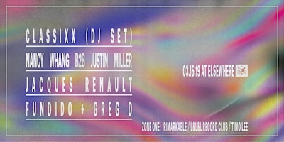 Classixx (DJ Set), Nancy Whang b2b Justin Miller, Jacques Renault, Rimarkable, L&L&L Record Club, Timo Lee, Fundido & Greg D @ Elsewhere