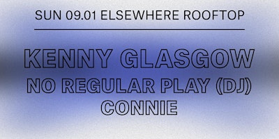☼ Performances└ Kenny Glasgow└ └ No Regular Play (DJ Set)└ └ └ Connie Doors: 2PMPerformances: 2PM - 10PMRoof deck closes at: 1AM---- ☼ About Elsewhere RooftopElsewhere Rooftop is a seasonal large outdoor bar and events space, offering a signature frozen drink menu, shows & parties, sunset DJ sessions, food pop-ups, film screenings, art happenings, and much more all summer. Full calendar at https://bit.ly/2UMjRb3 ☼ Hours*The Rooftop usually opens at 6PM Monday through Friday and 2PM Saturday & Sunday, but is only open when the following events are happening: https://bit.ly/2UMjRb3 — please do make sure to check the rooftop calendar before stopping by!  ☼ Rain or Shine PolicyAll shows and events on the Rooftop are rain or shine! If the weather prevents us from carrying on, we will update customers via our website, Facebook, Instagram, Twitter, Eventbrite and Resident Advisor.  ☼ Safer Space PolicyELSEWHERE MAINTAINS A STRICT ZERO TOLERANCE POLICY FOR HARASSMENTElsewhere is intended to be a safe space to enjoy music, art, expression, and free play. Our staff are trained to remove individuals engaging in any form of sexual harassment, acts of aggression (including leering), racism, misogyny, transphobia, homophobia, religious bigotry, or hatred and discrimination of any kind. If you see or experience any unwanted attention, contact, bullying, harassment, or behavior of any kind that makes you uncomfortable, please speak out and notify our staff immediately.Please read our full policy at: https://bit.ly/2VxByad