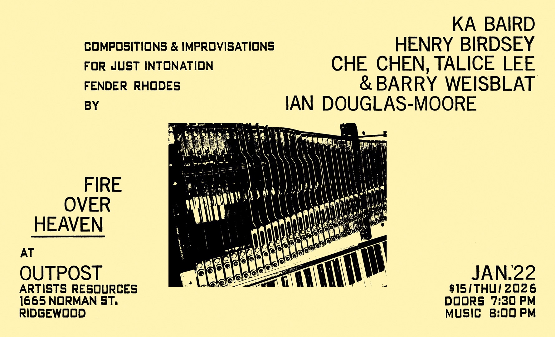 "Outpost Artists Resources is home to a number of treasures. One of the most intriguing to me has been the 88-key Fender Rhodes electric piano that was gifted by Steve Reich to our very own David Weinstein for work David did for the composer in the 80s. The instrument came out of storage in 2018 and a few months later, Fire Over Heaven programmer Che Chen put the Rhodes into a Just Intonation tuning he describes as “a mathematical found object, closer to the language of gongs than keyboards,” full of heady consonances and intense beating dissonances that are enhanced by the unruliness of the instrument.