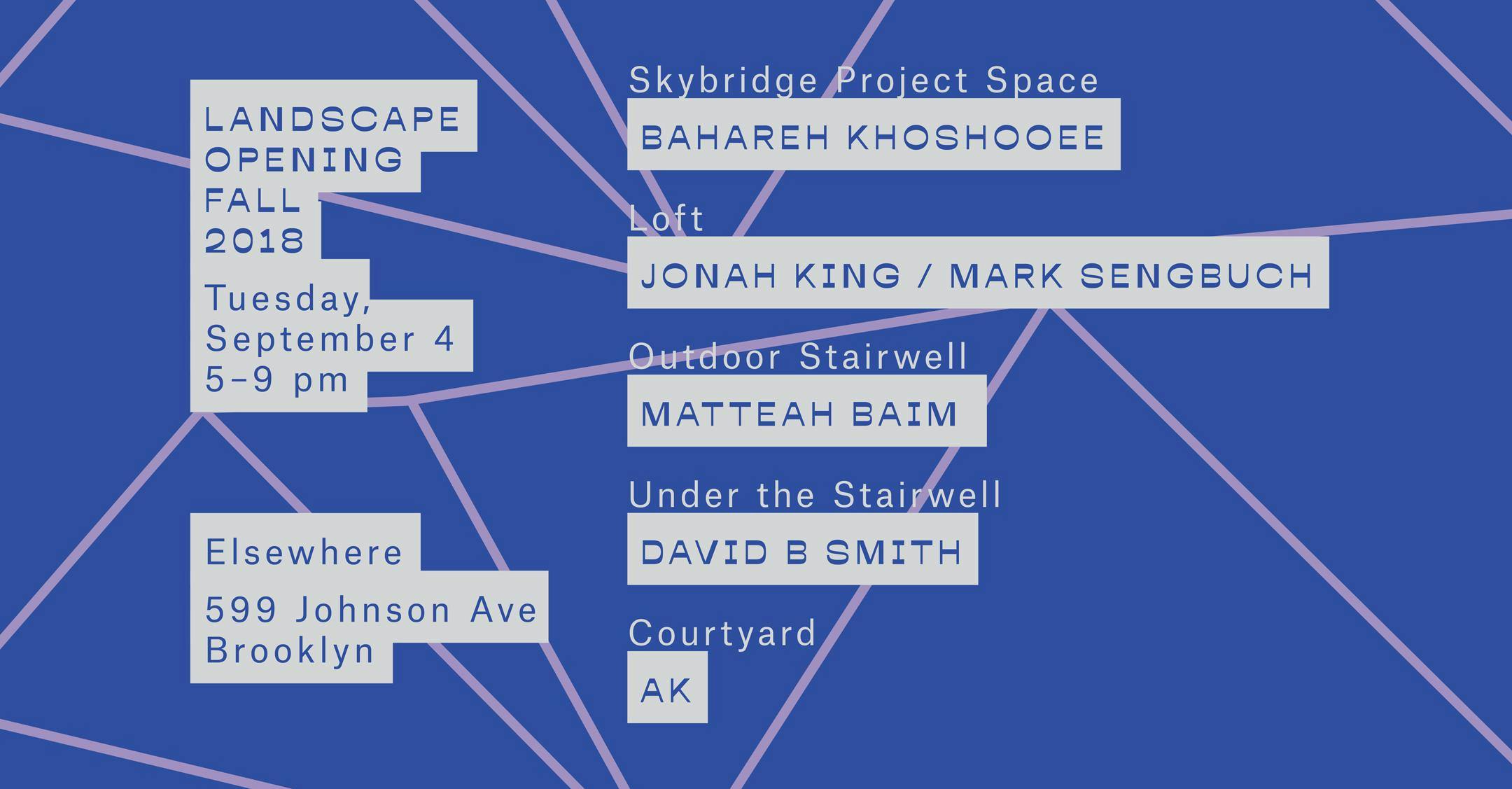 Elsewhere is pleased to present Landscape's Fall Opening showcasing six artists. Landscape, housed within Bushwick’s music venue Elsewhere, bridges the gap between visual art, music, and technology. Through installations, performances, commissions, and community events, Landscape builds on Elsewhere’s mission to place artists first, encouraging multi-disciplinary collaboration and experimentation. In an effort to create a sustainable platform the art program is funded by a portion of all Elsewhere tickets. By coming to a show or party at Elsewhere, our community is directly funding art commissions and installations.⟁ SEASON OPENING & EVENTS ⟁On September 4th curator Molly Surno opens the Fall Landscape program at Elsewhere. Six artists will kick off the season with a series of interventions throughout the building. Artists includeBahareh Khoshooee in the SkybridgeJonah King in the loft Mark Sengbuch in the loftMatteah Baim in the outdoor stairwellDavid B Smith under the stairwellAK in the courtyardPlease sign up to our mailing list for future notifications and RSVP. LANDSCAPE LIST ➟ http://bit.ly/landscapesubscribe