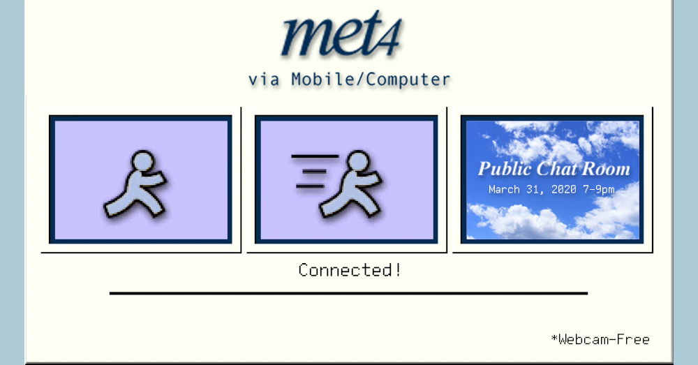 An event organized for those who are looking to come together via internet and express themselves in a safe and welcoming environment. The main focus of this chat is to share positive information (ideas, images, music, etc.) and building community by using a once popular form of real-time social communication. It is a chance for people to chat with each other without judgement or expectations!