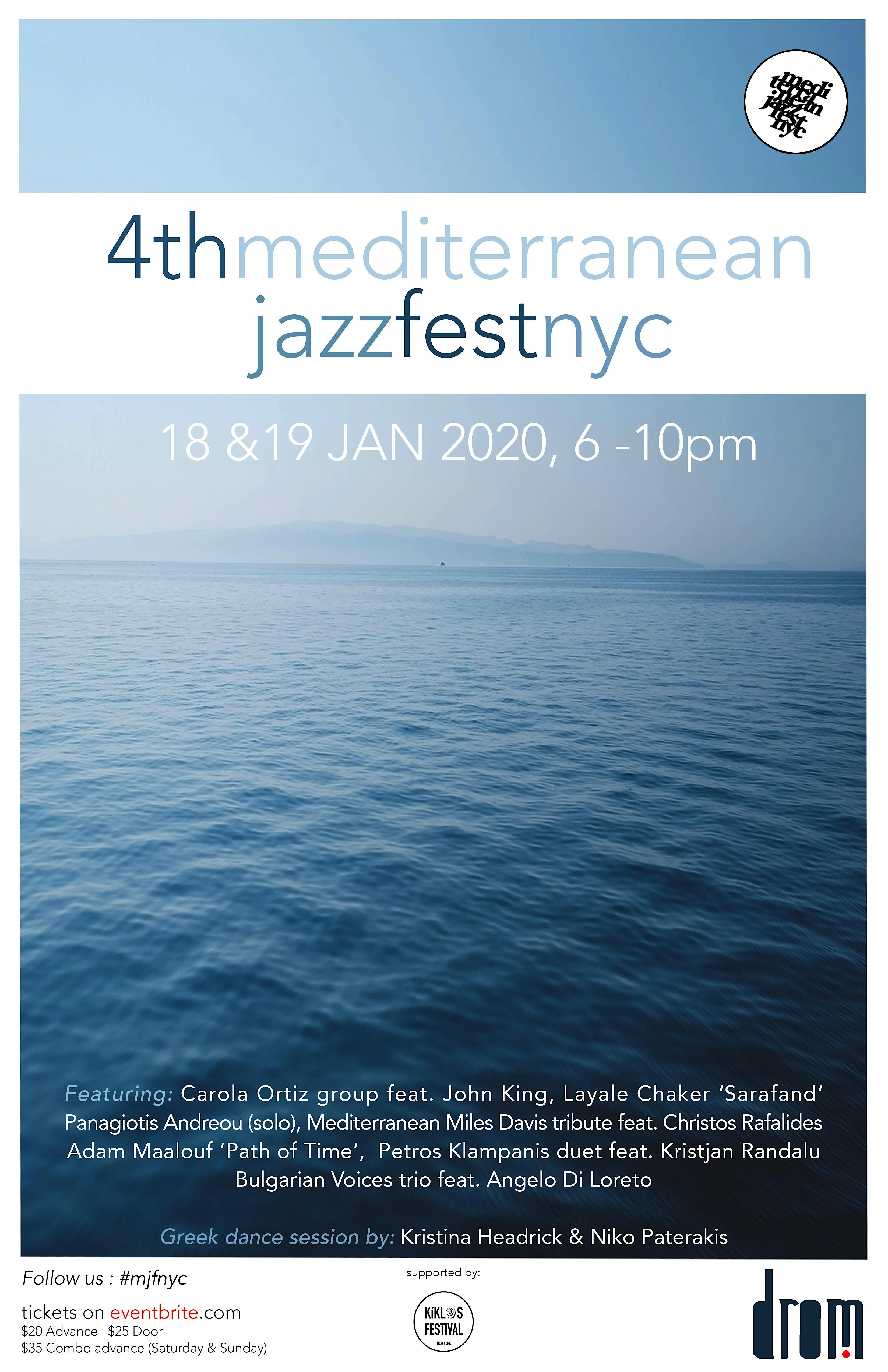 Escape the cold New York winter, let our artists take you on a journey and discover contemporary sounds from Athens, Beirut or Barcelona. After an amazing night on January 13, 2019 where five bands performed for a packed Drom, the MJF is back with its 4th edition. The festival continues to highlight a Mediterranean perspective on jazz and for the first time the festival will take place on two nights.