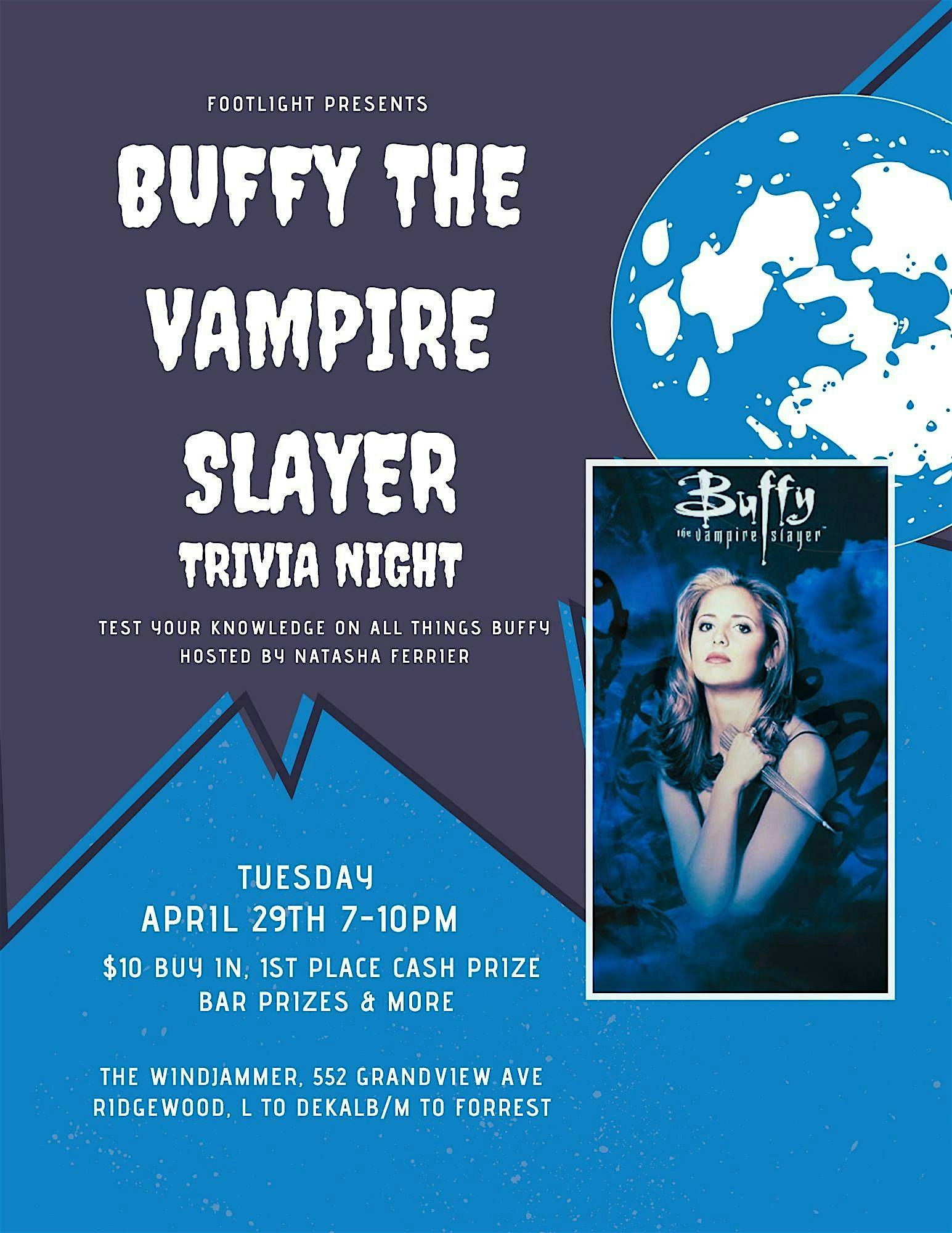 Footlight Presents:BUFFY TRIVIA NIGHThosted by Natasha Ferrier$5-10 buy in, 1st place cash prize, bar prizes & more7:30 doors, 8PM start