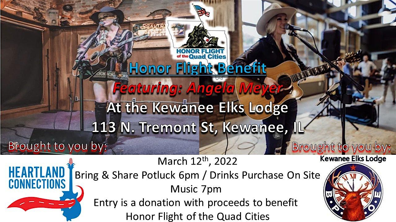 Heartland Connections in conjunction with the Kewanee Elks Lodge, presents Angela Meyer on March 12th, 2022. Angela will be performing to help raise money for the Honor Flight of the Quad Cities. This is the first Heartland Connection event hosted in Kewanee. Cost is a donation and all donations will be going to the Honor Flight of the Quad Cities. The show will take place at the Kewanee Elks Lodge at 113 N.l Tremont St, in downtown Kewanee, IL. Doors open at 6pm for a Bring& Share Potluck (Drinks must be purchased on site), with music starting at 7pm.