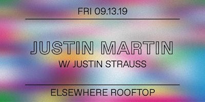 ADVANCE TICKETS ARE NOW SOLD OUT, PLENTY WILL BE AVAILABLE AT THE DOOR NIGHT OF, PLEASE ARRIVE EARLY TO ENSURE ENTRY☼ Performances└ Justin Martin└ └ Justin Strauss Doors: 5PMPerformances: 5PM - 10PMRoof deck closes at: 4AM---- ☼ About Elsewhere RooftopElsewhere Rooftop is a seasonal large outdoor bar and events space, offering a signature frozen drink menu, shows & parties, sunset DJ sessions, food pop-ups, film screenings, art happenings, and much more all summer. Full calendar at https://bit.ly/2UMjRb3 ☼ Hours*The Rooftop usually opens at 6PM Monday through Friday and 2PM Saturday & Sunday, but is only open when events are happening — please do make sure to check our venue calendar before stopping by here: https://bit.ly/2VHNafy☼ Rain or Shine PolicyAll shows and events on the Rooftop are rain or shine! If the weather prevents us from carrying on, we will update customers via our website, Facebook, Instagram, Twitter, Eventbrite and Resident Advisor.  ☼ Safer Space PolicyELSEWHERE MAINTAINS A STRICT ZERO TOLERANCE POLICY FOR HARASSMENTElsewhere is intended to be a safe space to enjoy music, art, expression, and free play. Our staff are trained to remove individuals engaging in any form of sexual harassment, acts of aggression (including leering), racism, misogyny, transphobia, homophobia, religious bigotry, or hatred and discrimination of any kind. If you see or experience any unwanted attention, contact, bullying, harassment, or behavior of any kind that makes you uncomfortable, please speak out and notify our staff immediately.Please read our full policy at: https://bit.ly/2VxByad