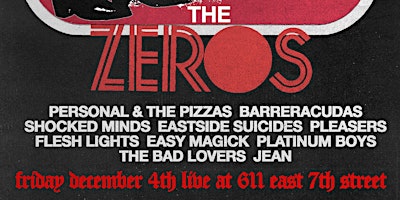 FRIDAY DECEMBER 4THBARRACUDA 611 E 7TH8:00 JEAN8:30 PLEASERS9:00 BAD LOVERS9:30 PLATINUM BOYS (MILWAUKEE)10:00 EASY MAGICK (ATLANTA)10:30 FLESH LIGHTS11:00 EASTSIDE SUICIDES (FIRST SHOW IN 11 YEARS)11:30 SHOCKED MINDS (ATLANTA)12:00 PERSONAL & THE PIZZAS (SAN FRANCISCO)12:30 BARRERACUDAS (ATLANTA)1:00 THE ZEROS (CHULA VISTA)