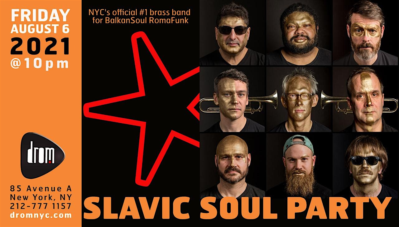 Fiery Balkan brass, throbbing funk grooves, Roma (Gypsy) accordion wizardry, and virtuoso jazz chops make Slavic Soul Party! NYC’s official #1 brass band for BalkanSoul GypsyFunk. SSP! pumps a strong Balkan brass sound through the filter of life in New York’s outer boroughs, making new music out of the unplanned results of immigration, proximity, and globalization. Over the past 15 years the band has released 7 full-length albums, and toured in the US, Canada, Mexico, Europe, Turkey, and Zimbabwe, from pasha’s palaces to dive bars, Carnegie Hall to Serbian schoolyards, festival stages to prison courtyards. The band’s music has fans on both sides of the Atlantic, and their tunes have been covered by Serbian brass stars, New Orleans funk stalwarts, and legendary street bands. SSP!’s Tuesday night residency in Brooklyn has become a destination for music fans from around the world, and is famous for “delivering a great time.” (New York Times)