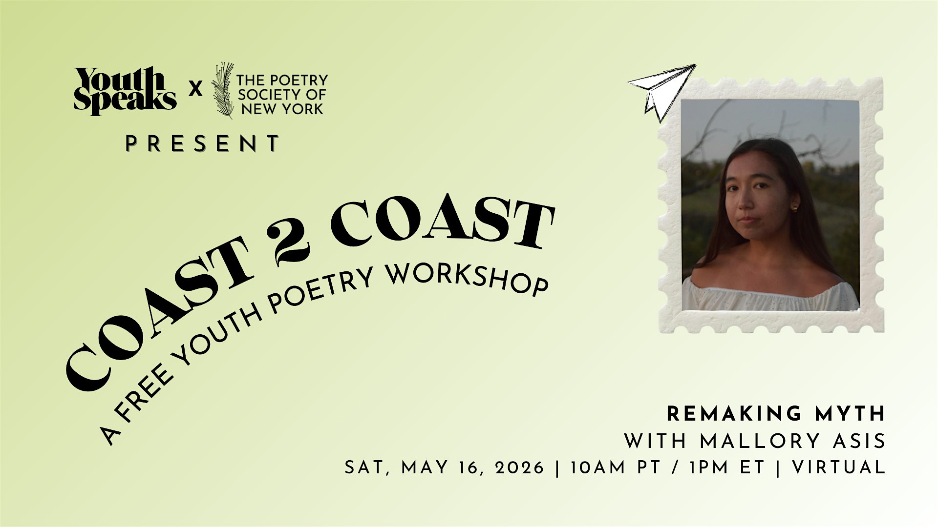 Join The Poetry Society of New York & Youth Speaks for a free, virtual, generative poetry workshop by youth for youth, with Mallory Asis!