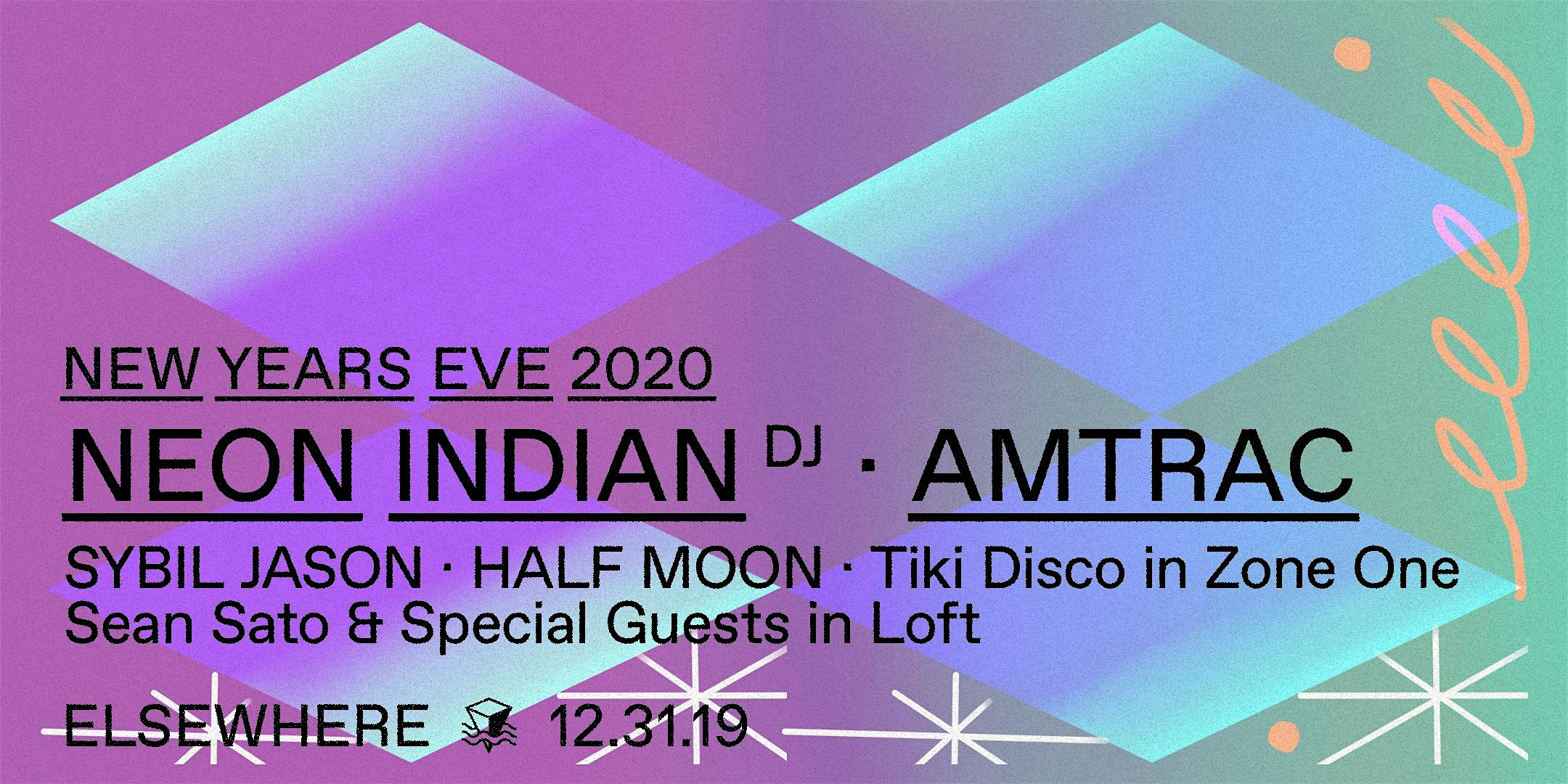 ADVANCE TICKETS ARE NOW SOLD OUT EXCEPT FOR 2AM ENTRY, BUT PLENTY WILL BE AVAILABLE WHEN DOORS OPEN, BEGINNING AT 9PM. TICKET SALES WILL NOT BEGIN BEFORE DOORS OPEN, AND ARE FIRST-COME FIRST-SERVE. PLEASE ARRIVE EARLY TO ENSURE ENTRYElsewhere New Year's Eve!9PM - 6AMDOOR PRICE: $60Lineup:HALL└ Neon Indian (DJ Set)└ Amtrac└└ Sybil Jason└└└└ Half MoonZONE ONE└ Tiki DiscoLOFT└ Data General B2B Andris Balins B2B Sean Sato* champagne toast at midnight! *it's the dawn of a new decade as we plunge into the roaring 20's and we're proud to have a slew of incredible artists joining the massive multi-room celebration. pioneering producer Neon Indian will be on decks, alongside dj/producer Amtrac whose driving funk-filled eclectic sets never disappoint.we're also welcoming some of our favorite local crews: Half Moon, alongside Rinse France's FARCED host, Sybil Jason. in Zone One, Brooklyn's disco and house tastemakers Eli Escobar, Lloydski, and Andy Pry will be throwin it down all night as the famed Tiki Disco crew. finally, enjoy the eclectic sounds of our very own Sean Sato and friends up in the loft. and as always: a venue-wide champagne toast at midnight!Elsewhere is intended to be a safe space to enjoy music, art, expression, and free play. Elsewhere reserves the right to deny, remove and/or ban any customer deemed to be disrespecting our zero-tolerance harassment policy. Please read our full policy at: https://bit.ly/2VxByad All ticket sales are final, and Elsewhere does not offer refunds for any reason except event cancellation or reschedule. Opening performers, door times, and set times are subject to change without notice. All ticket holders must present a valid US government-issued ID or passport upon entering, and Elsewhere reserves the right to refuse entry without refund to anyone who does not have a valid ID or meet the event's age requirement. Please note that Elsewhere does not accept foreign IDs of any kind other than passports. Elsewhere does not guarantee the validity or use for admittance of tickets purchased via 3rd party resellers of any kind.