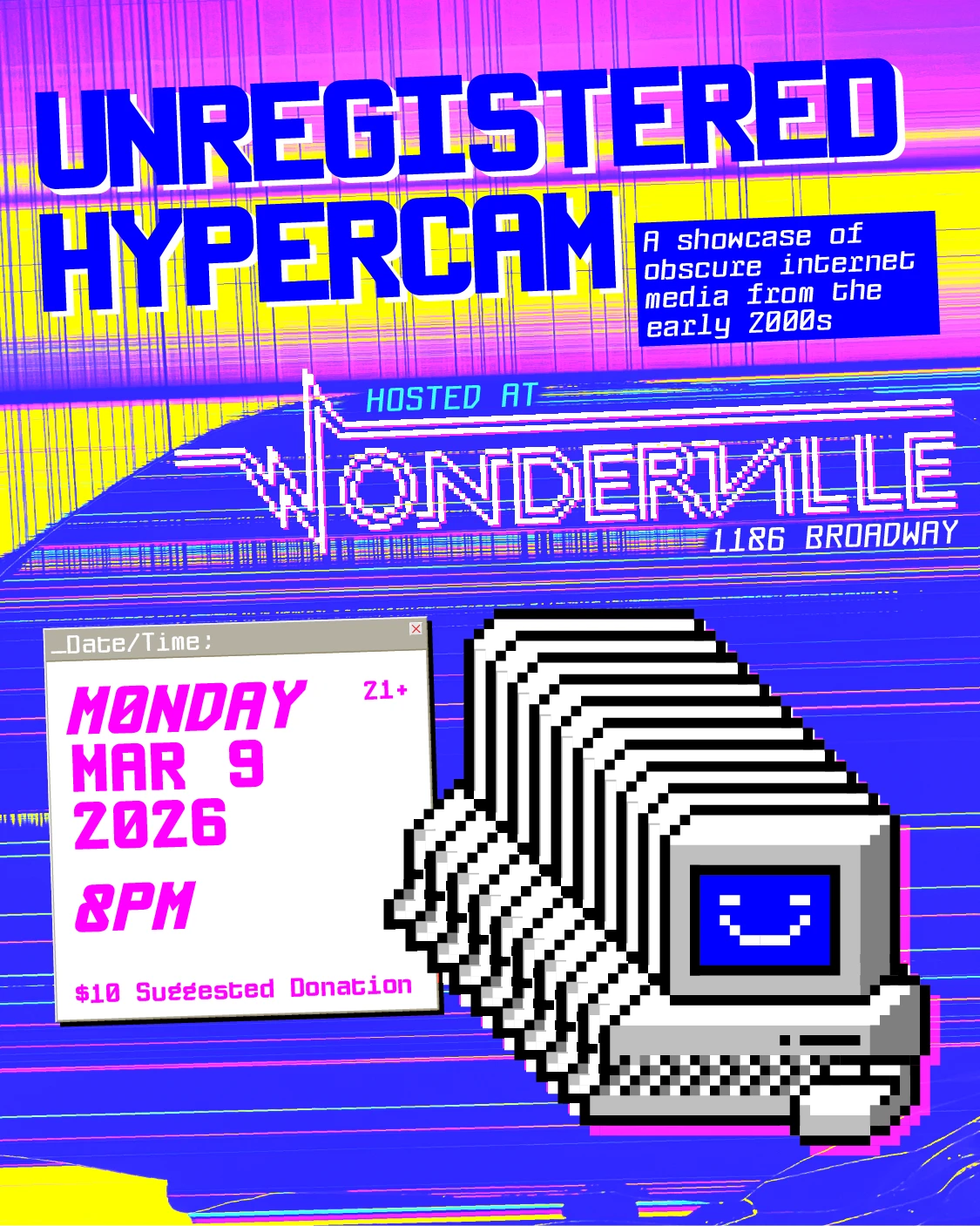 Unregistered HyperCam is a stand-up/storytelling show featuring comedians discussing a beautifully obscure, strange, or otherwise culturally remarkable piece of media from the early 2000s. Essentially, show-and-tell themed around all the amateur, obscure, wonderfully low-res content that made the early(ish) internet so fun and silly (plus a 2000s DJ set afterwards!)