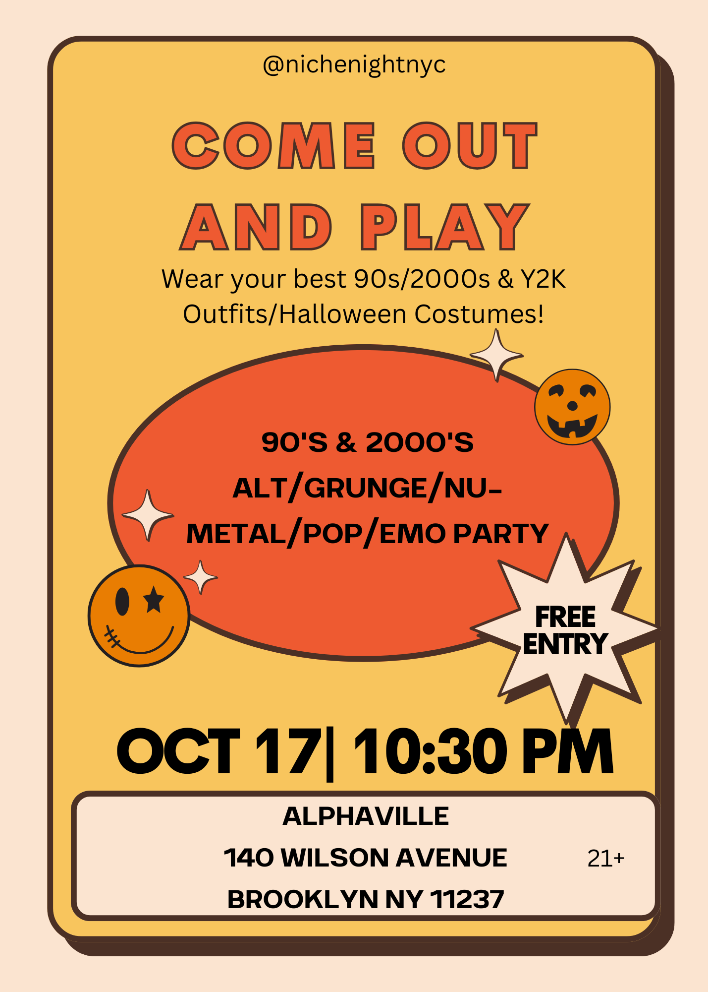 Nirvana, Nine Inch Nails, The Offspring, No Doubt, Third Eye Blind, Korn, System of a Down & tons of other alt throwbacks, 90’s Dad rock, nu-metal, and some emo & pop songs for fun! Come dressed in your favorite 90’s/Y2K looks. Nostalgic candy & dancing! Requests are welcome!