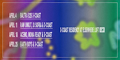 serbian-born producer and DJ X-Coast creates a buoyant combination of lo-fi house, 90's rave music, and tropical sounds. since moving to brooklyn, the artist has become a staple of the city's underground dance scene. since the start of the year, the artist has released "mi sabor," his debut for big beat records, and a 2-track ep caleed 'bailando.' x-coast has also recently announced the launch of his own record label called riviera records. he's joined by the likes of baltra, raw unkut, dj sofiia, ace mo, moma ready, and earth boys for his april residency in the elsewhere loft.