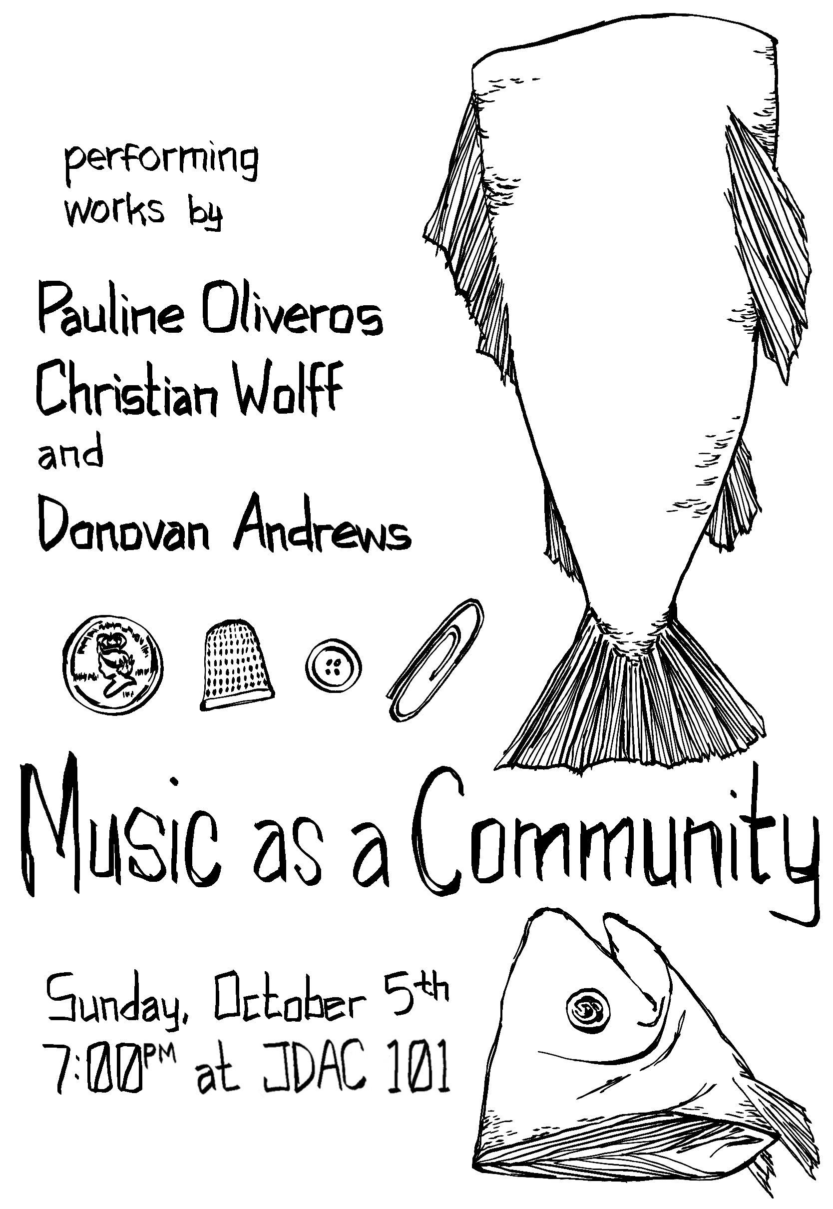 Music as a Community provides the opportunity for people who may not have prior musical knowledge to perform experimental music. Audience members are able to be performers in all works selected. The recital will be recorded and uploaded following the performances.