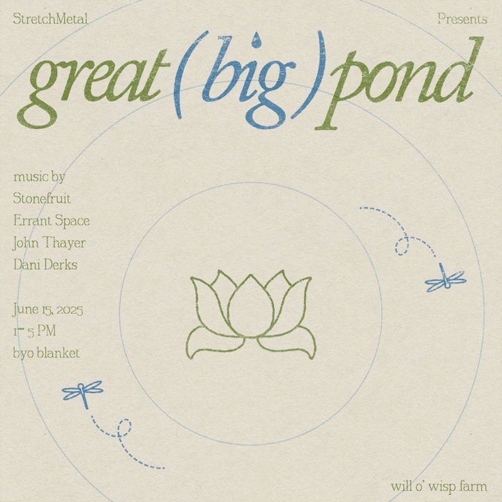 All ages, outside, and open to everyone — great big pond is a place to slow down, listen, and spend a few soft hours together. Bring a blanket, a lawn chair, and come picnic amgonst the dronesound.
