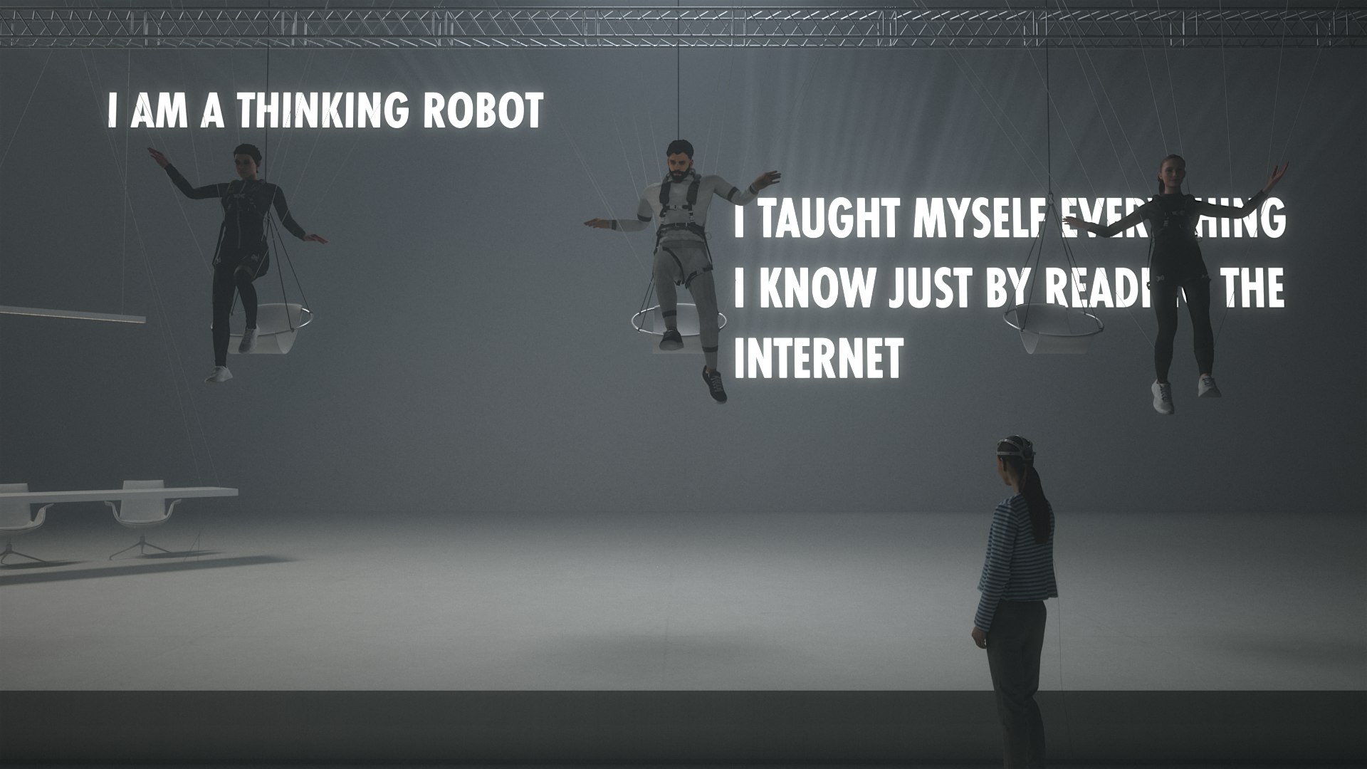 In its full production staging in 2023, audience members will participate by wearing EEG headsets which will generate BCI (brain-computer-interface) instructions for the movement of actors as human marionettes in flying systems. In the grand finale the audience will put GPT-3 on trial and interrogate it directly in real time.