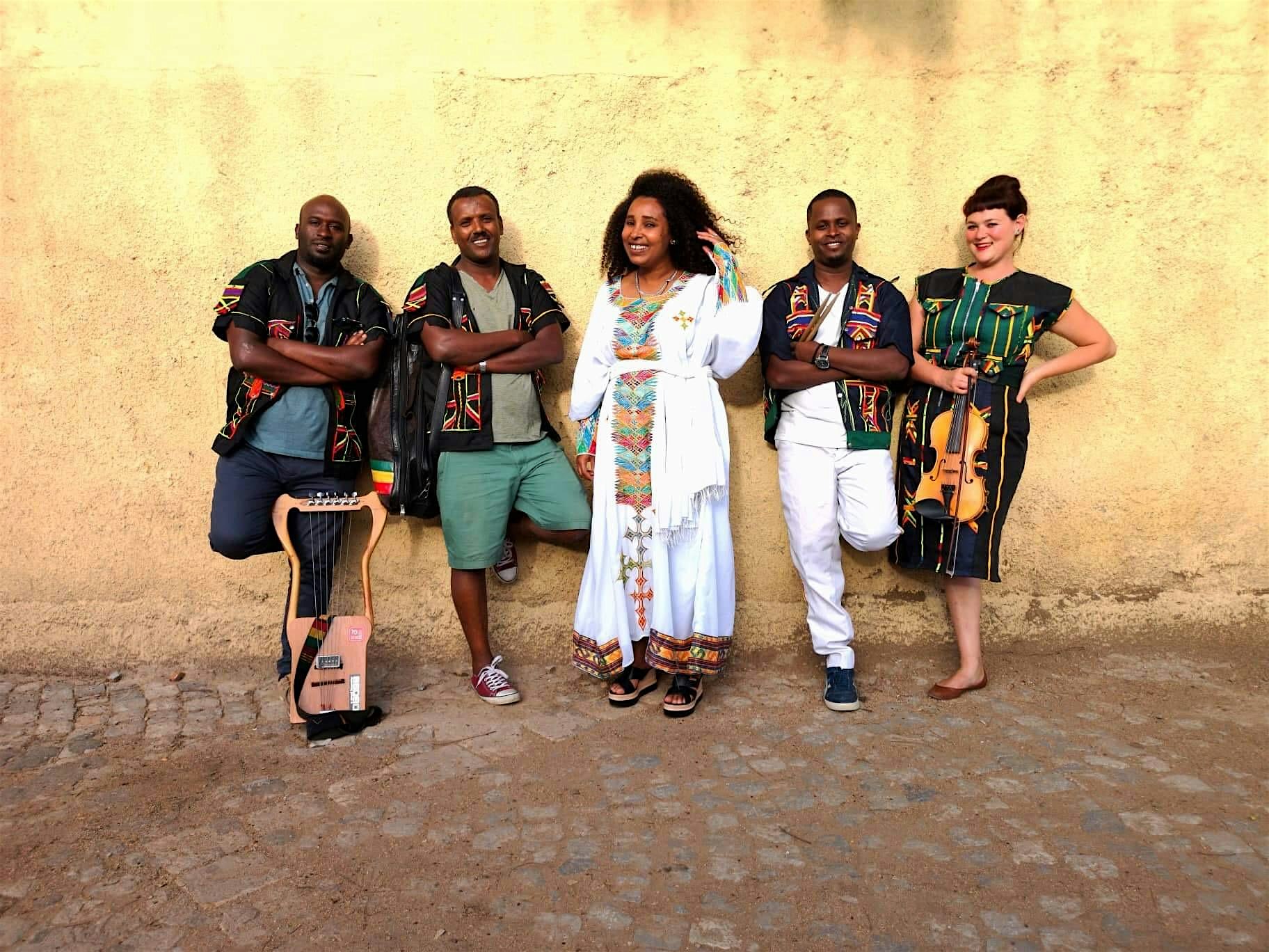 Beaming in from the sizzling Addis Ababa nightlife scene, this group shines an experimentalism based in the virtuosity of rooted traditions. With swirling masinko (one-stringed fiddle), wah-wah violin, bass krar grooves, the heavy riffs of goat skin kebero beats, and powerful mellismatic lead African diva vocals, QWANQWA keeps the people rapt in celebratory attention. QWANQWA's debut US tour of 54 concerts in Fall 2022 brought the poignant euphoric experience to storied jazz clubs, sticker slapped rock clubs, folk festivals, prestigious music institutions, street festivals, universities, and country opera houses, all the while unifying these audiences as they clap along "Music is Universal Language"