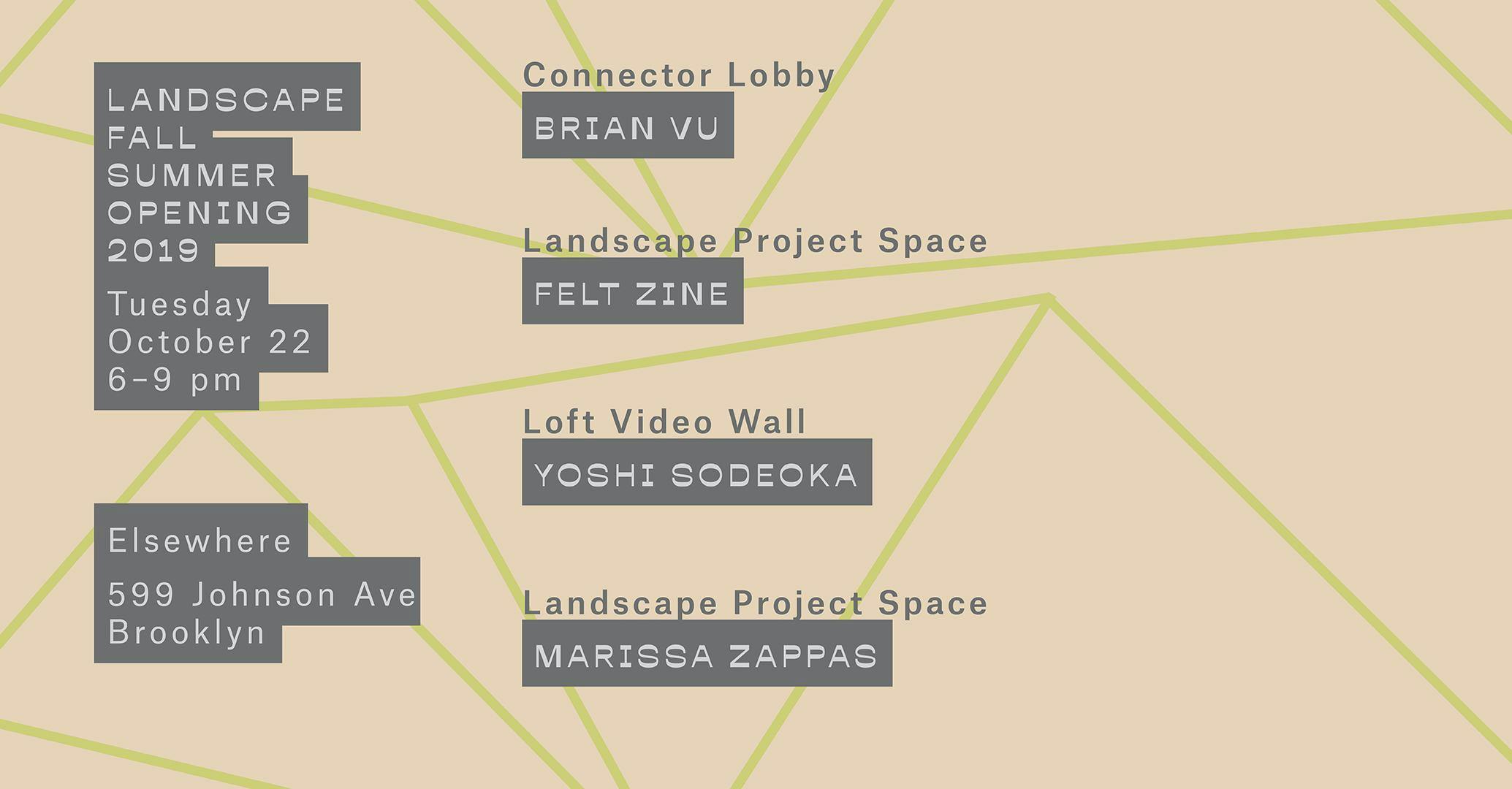 Elsewhere is pleased to announce the Fall season program for Landscape, an arts initiative and curatorial program housed within the Elsewhere music venue. The Fall season will feature multimedia works by artists Brian Vu, Felt Zine, Yoshi Sodeoka, and Marissa Zappas on view from October 22nd, 2019 - January 15 2020 with an opening reception taking place on October 22, 2019 from 6 - 9 pm at Elsewhere (599 Johnson Ave., Brooklyn, NY 11237). Additionally Felt Zine will throw a special event on December 6th to celebrate their collaborative works with Elsewhere DJ’s. On October 22nd, curator Molly Surno opens the Fall Landscape program at Elsewhere. Four artists will kick off the season with a series of interventions throughout the building. Artists include:▨ Brian Vu in the Connector Lobby ▨▨ FELT Zine in the Project Space ▨▨ Yoshi Sodeoka in the Loft Video Program ▨▨ Marissa Zappas in the Project Space ▨