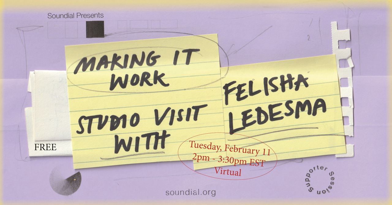 The session will include a studio tour, live demonstrations of Ledesma’s sound practice, and time for questions. Participants will gain insight into cultivating a sustainable, adaptive creative practice that responds to constraints and the surprises that come from simply showing up to make work.