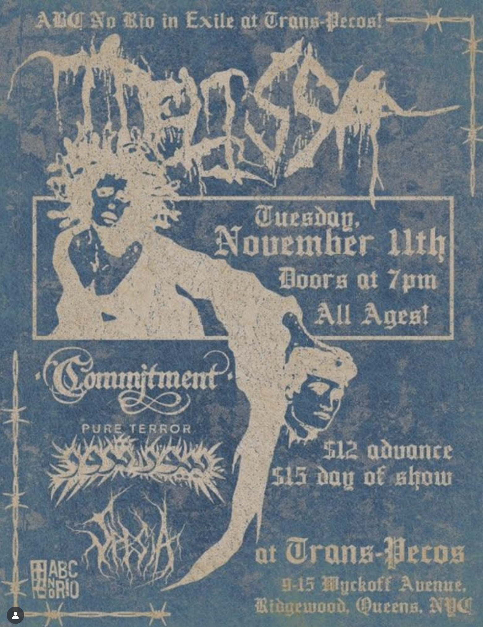 Featuring Brooklyn’s black metal punx Melissa, Philly anti-imperialist hardcore/punx Commitment (members of Soul Glo & Backslider!), Brooklyn Pan Arab hardcore kids Pure Terror, and NYC melodic crust project Spesia kicking things off!