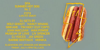 heads up y'all: this summer season, the Elsewhere Rooftop will be open all night on weekends space-permitting, so grab a frozen drink with a view of the skyline when you need a breather! if you've never been to our space, there is lots else to explore too! our parties are multi-room celebrations, featuring a very large cavernous warehouse hall and a cozy dance floor in the side room, plus a small hideaway lounge tucked into the 2nd floor. make sure to wander!-- We're back! DFA Records Summer Hot Dog No 2 └ CCFX (LIVE NYC Debut) DJ Sets By: └ Holy Ghost!└ Nancy Whang └ Juan MacLean └ Sinkane └ Man Power└ Museum of Love└ DJ Voices└ Barbie Bertisch└ Monika└ Liv Spencer└ Jay Green└ Tim Hoey (Cut Copy)+ very special guests