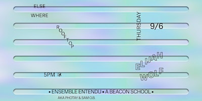 └ Elijah Wolf└└ Ensemble Entendu (aka Photay & Sam O.B.)└└└ A Beacon SchoolDoors: 5PMHappy hour: 5PM – 7PM ($4 beers, $4 wells)Performances: 7PM - 10PMRoof closes: 1AM