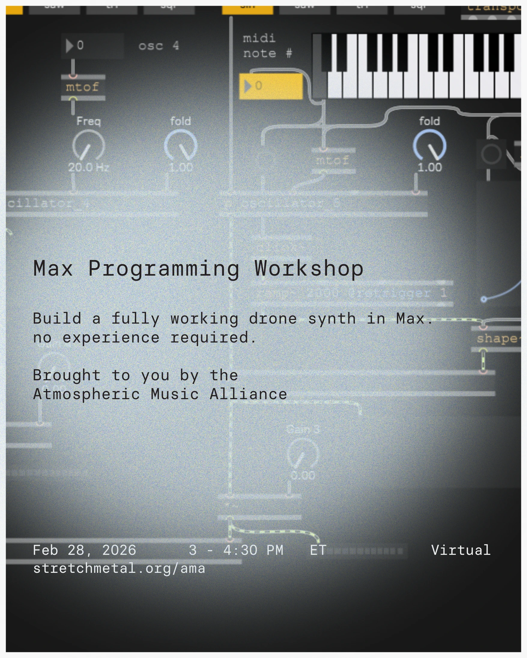 In this workshop, we'll go over some of the basics of synthesis, programming in Max, and in the end, you will have a fully functional drone synth. No prior Max/MSP experience required.
