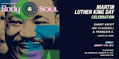 Tickets are sold out but we will have a limited amount of tickets available at the door space permitting right at 6 PM! 6PM - 2AMThe Body & SOUL team is gathering for their yearly celebration of Martin Luther King's life and legacy. This one is at a brand new club in Bushwick: Elsewhere.Music by:Joe ClaussellFrançois K.Danny KrivitLights by ArielTickets are:$20 early bird (limited; until they run out)$25 advance online$30 at the door.More info: http://bodyandsoul-nyc.com/