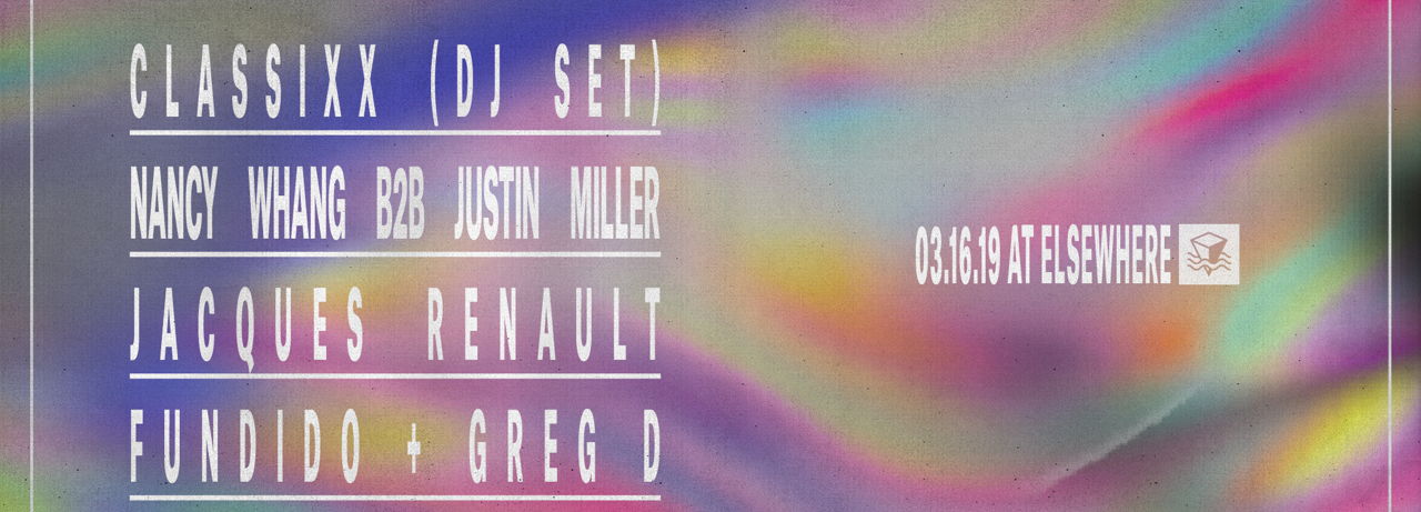 Classixx (DJ Set), Nancy Whang b2b Justin Miller, Jacques Renault, Rimarkable, L&L&L Record Club, Timo Lee, Fundido & Greg D @ Elsewhere